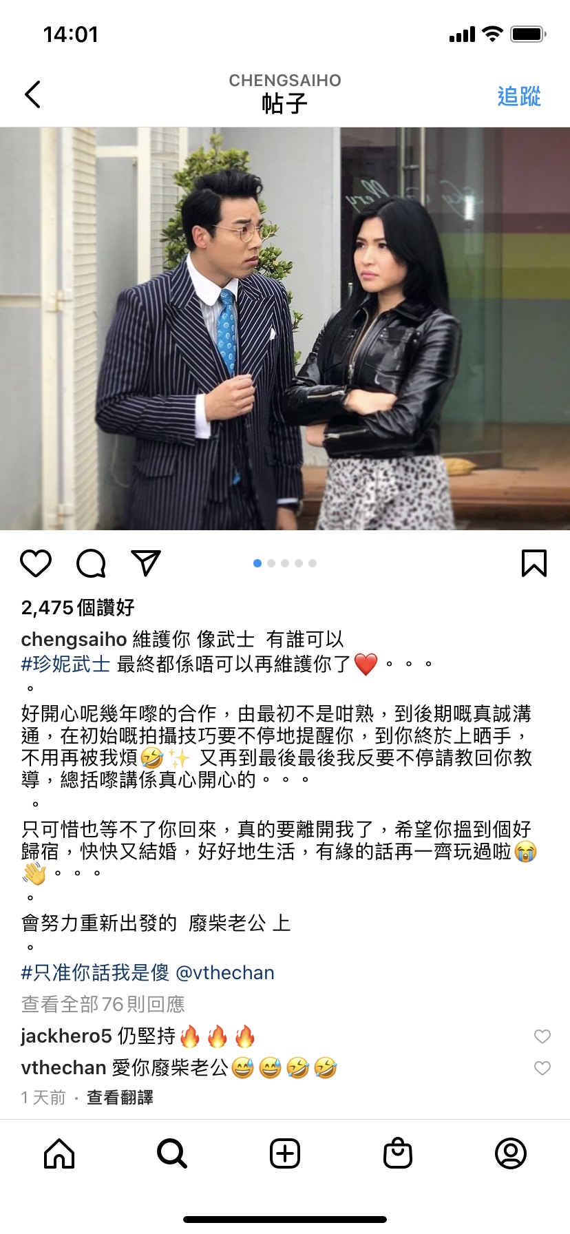 細龍生留言表示:「維護你 像武士 有誰可以 #珍妮武士 最終都係唔可以再維護你了。。。。好開心呢幾年嚟的合作,由最初不是咁熟,到後期嘅真誠溝通,在初始嘅拍攝技巧要不停地提醒你,到你終於上晒手,不用再被我煩,又再到最後最後我反要不停請教回你教導,總括嚟講係真心開心的。。。。只可惜也等不了你回來,真的要離開我了,希望你搵到個好歸宿,快快又結婚,好好地生活,有緣的話再一齊玩過啦。。。。會努力重新出發的 廢柴老公 上。#只准你話我是傻 」細龍太就回他說:「愛你廢柴老公。」