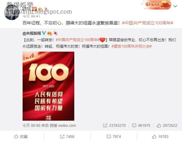 中共建黨百年大慶7月1日在天安門舉行,不少香港人藝人也有微博向中共黨祝賀,包括鍾欣潼、佘詩曼、周柏豪、梁競徽、楊千嬅、林保怡、方中信、黎耀祥、湯寶如、張衛健等等,其中早前被中國網民抵制的周柏豪,更深情寫上:「祝福祖國,祝福黨!願偉大的祖國繁榮昌盛,國泰民安!」令人動容。