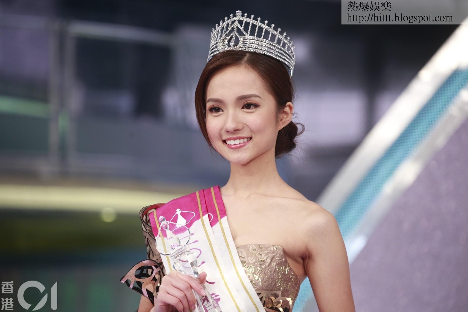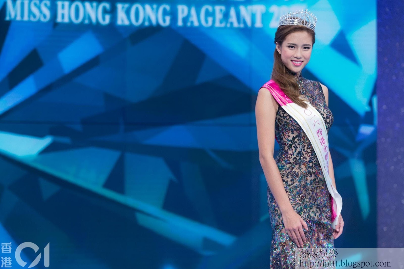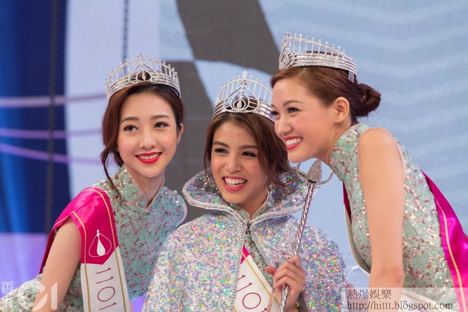 2015年港姐冠軍係麥明詩(圖中),左邊是亞軍龐卓欣,右手邊是季軍郭嘉文,即現在李澤楷女友。(視覺中國)