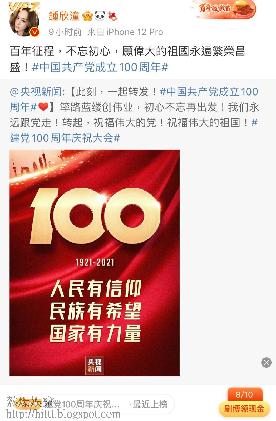 中共建黨百年大慶7月1日在天安門舉行,不少香港人藝人也有微博向中共黨祝賀,包括鍾欣潼、佘詩曼、周柏豪、梁競徽、楊千嬅、林保怡、方中信、黎耀祥、湯寶如、 ...