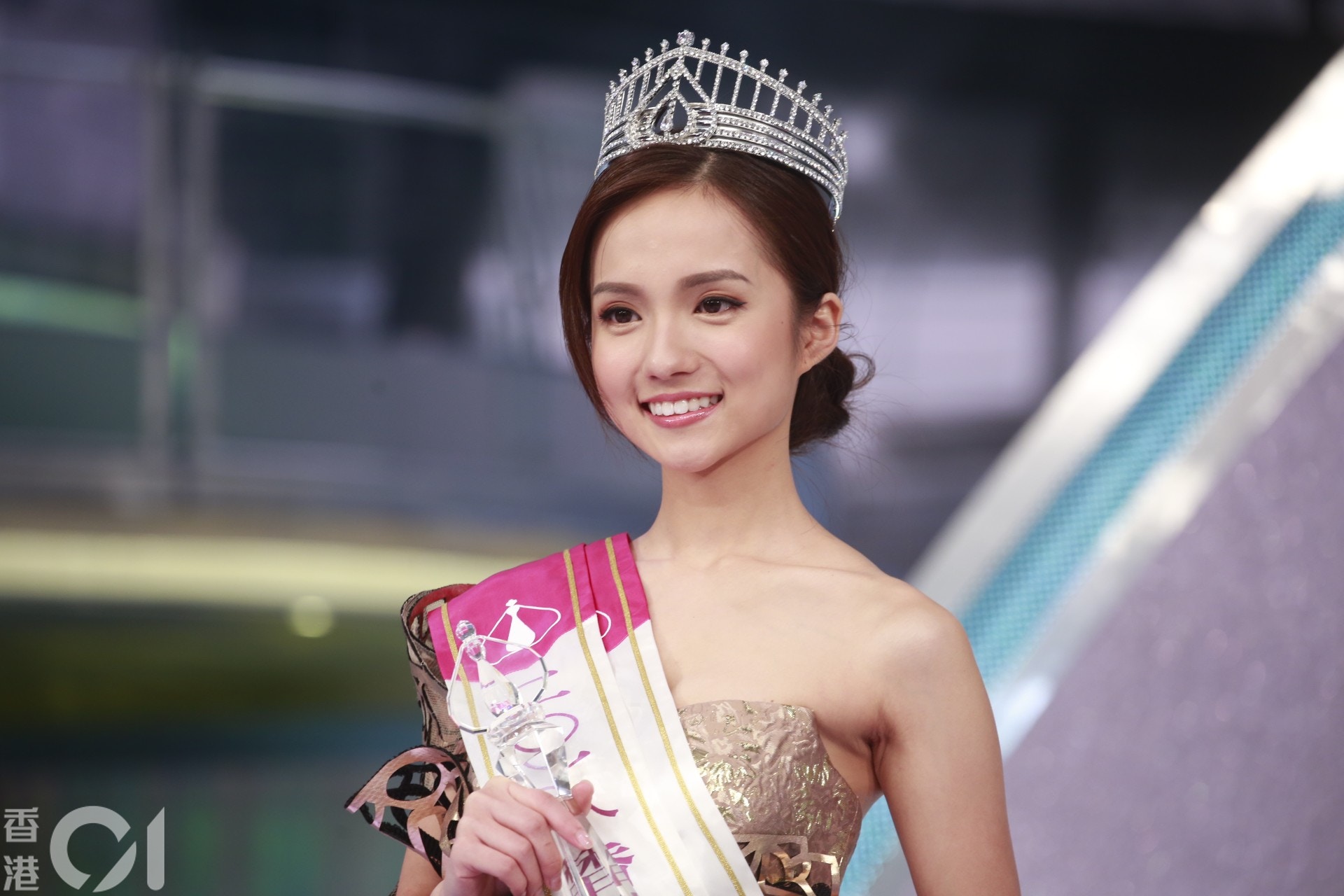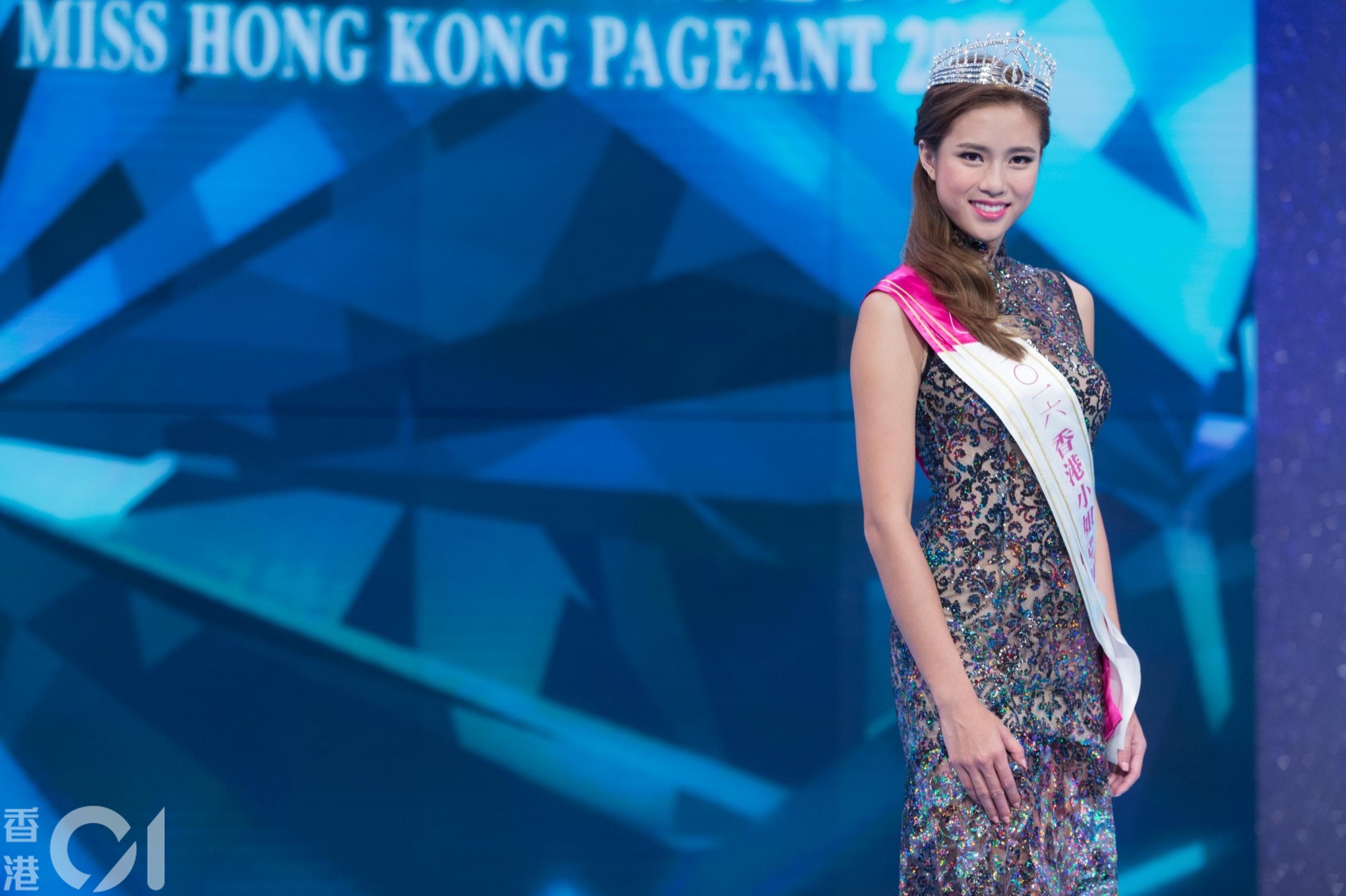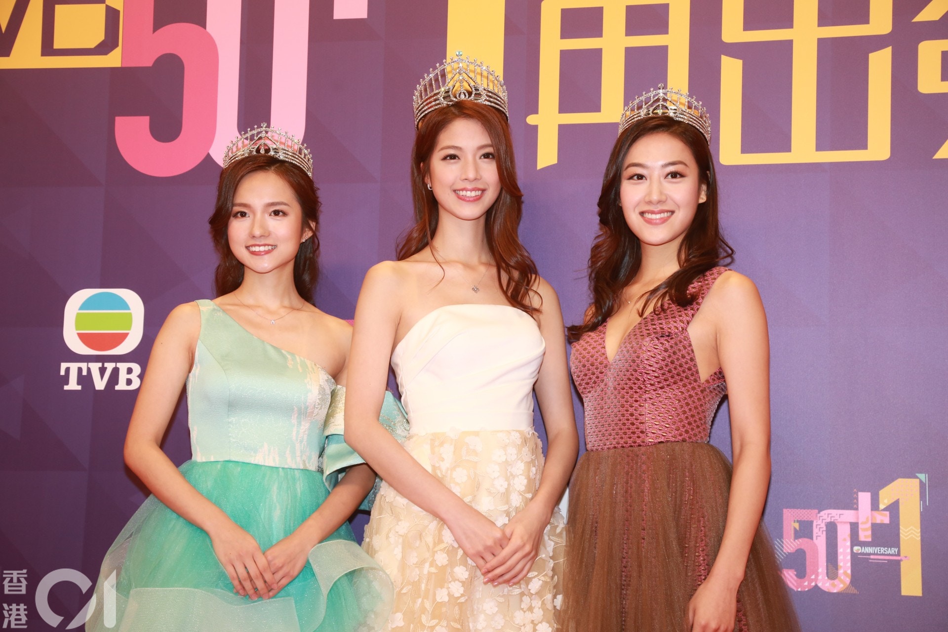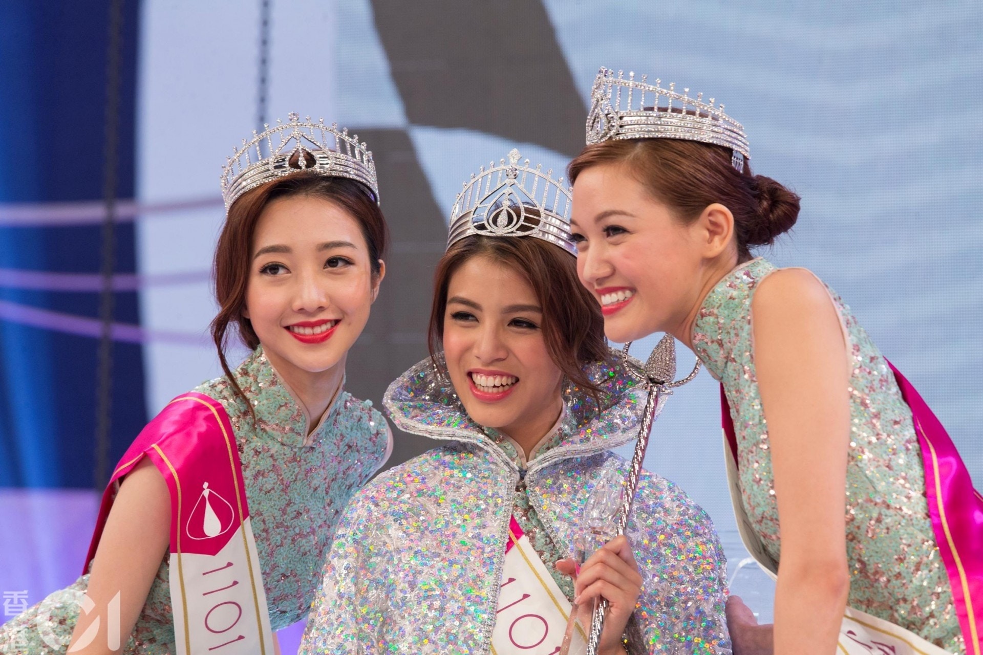 2015年港姐冠軍係麥明詩(圖中),左邊是亞軍龐卓欣,右手邊是季軍郭嘉文,即現在李澤楷女友。(視覺中國)