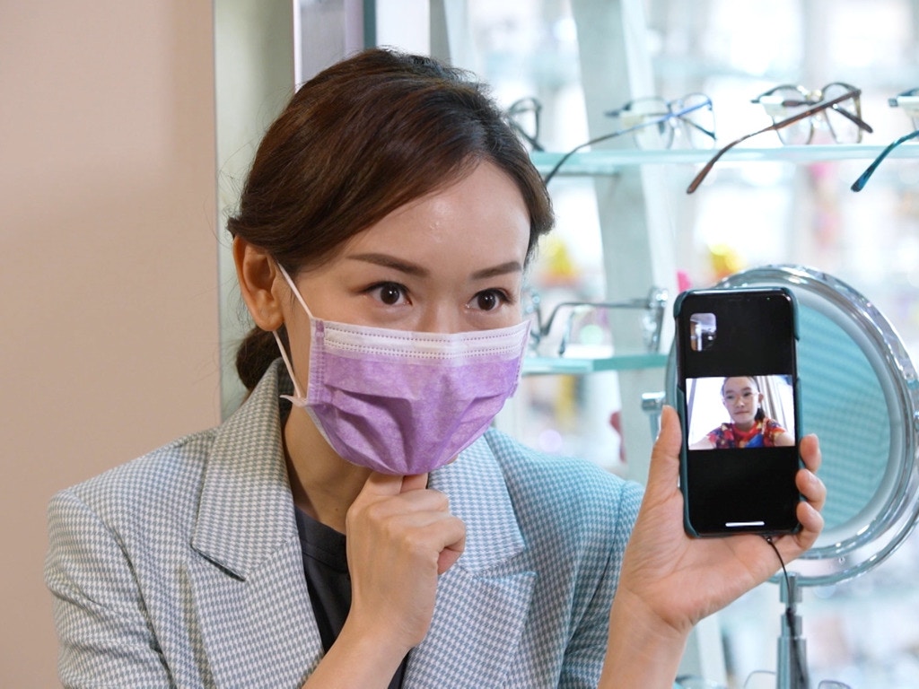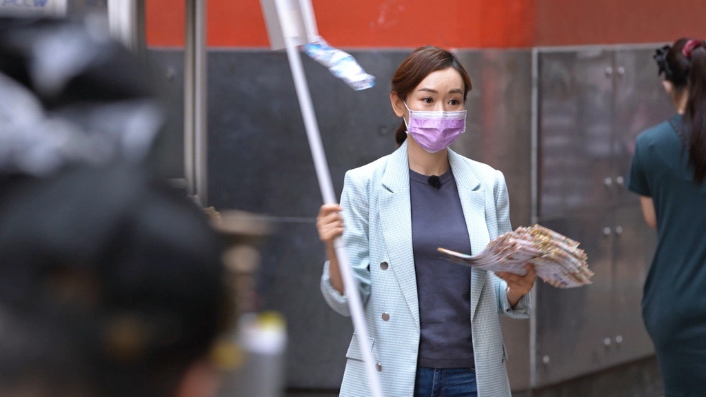 【楊思琦】楊思琦先走到街頭為樓上眼鏡店派傳單,更要落手落腳自製宣傳牌。努力工作期間,思琦更爭取時間跟囝囝囡囡視像通話,問女兒有否完成功課。(《中女唔易做》劇照)