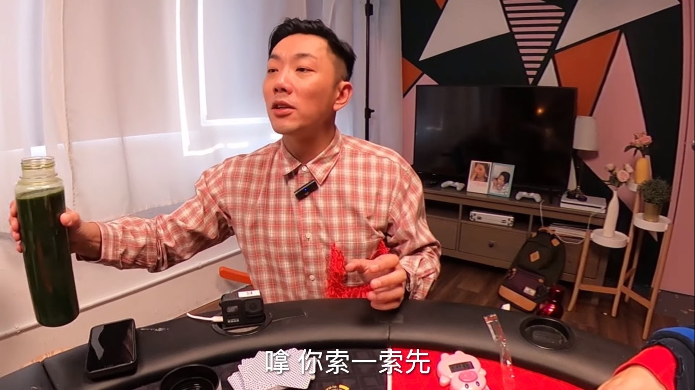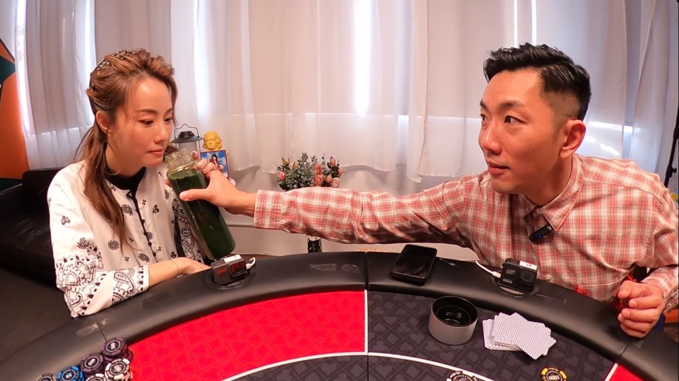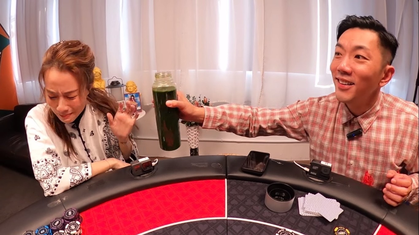 鄧麗欣試飲芫荽汁。(YouTube/@Round Table Poker)