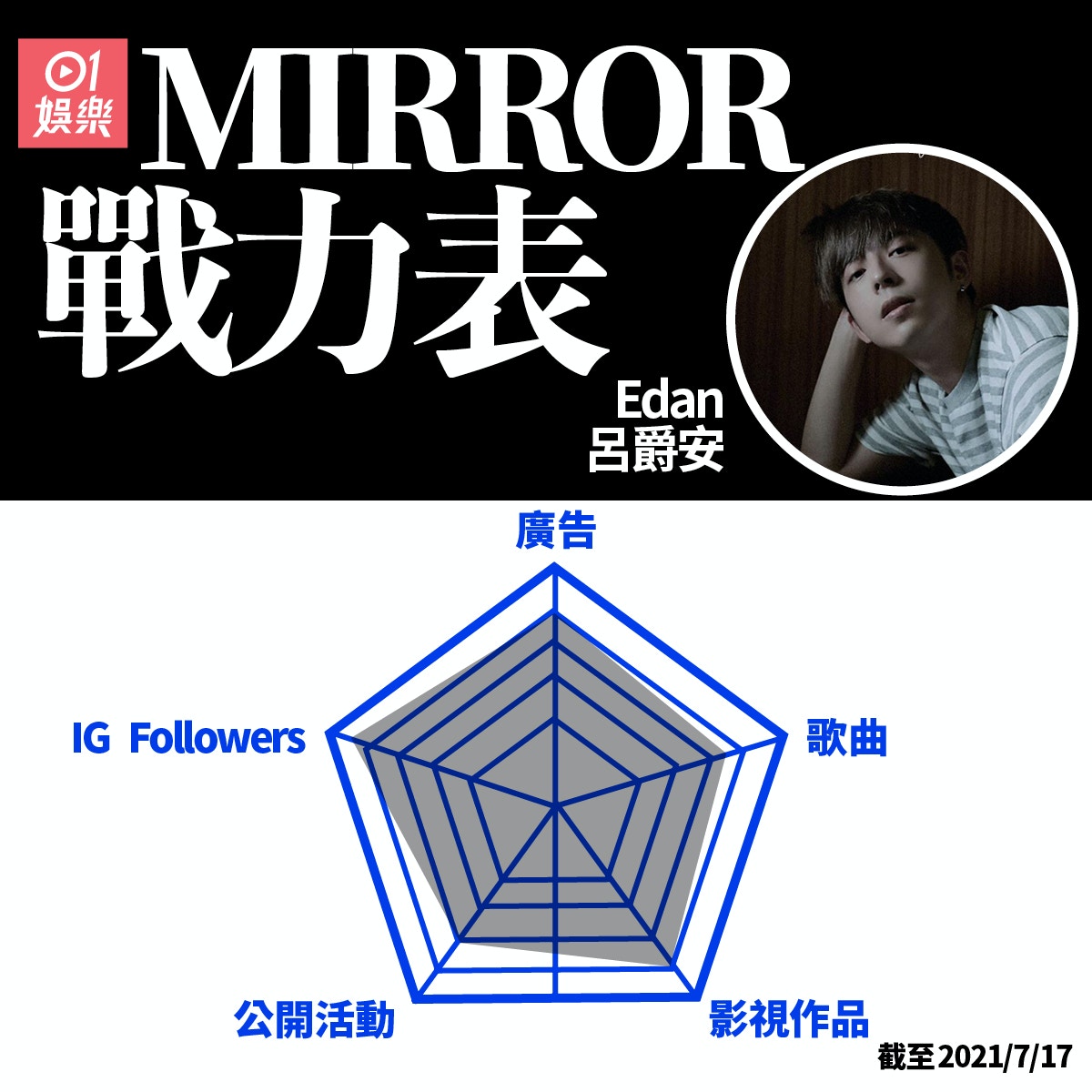 影視作品戰力緊隨其後的是憑港版《大叔的愛》而爆紅的Edan,他的IG Followers戰力亦相當強勁。(01製圖)