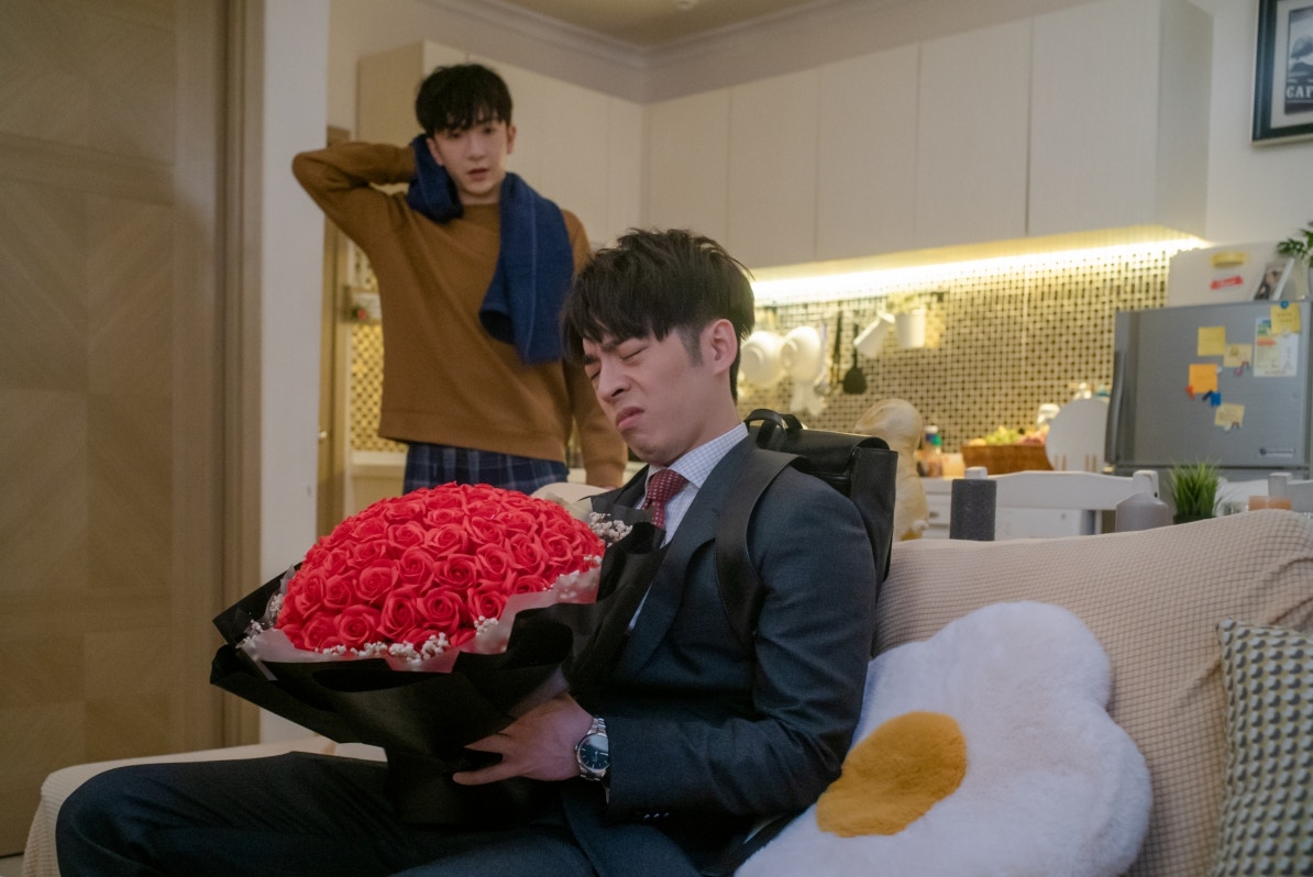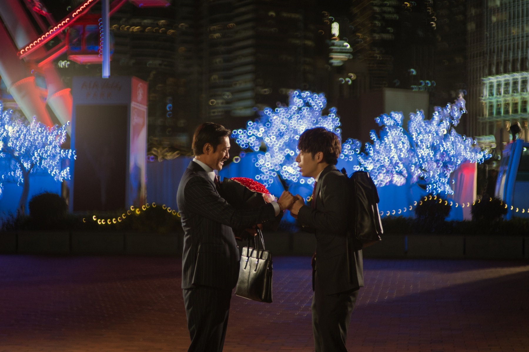 黃德斌拿着一大束玫瑰花在摩天輪下向Edan表白。(劇照)