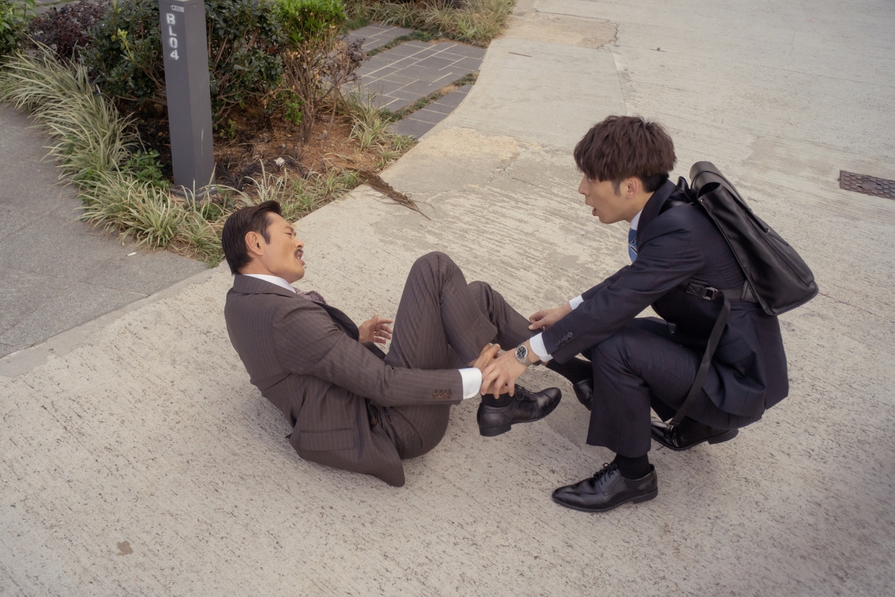 Edan單膝下跪為黃德斌處理傷口。(劇照)