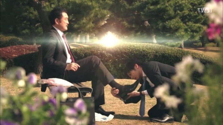部長十年前因一次意外扭傷腳,春田馬上去買膠布還細心貼上,最後為上司穿好鞋。(網上圖片)