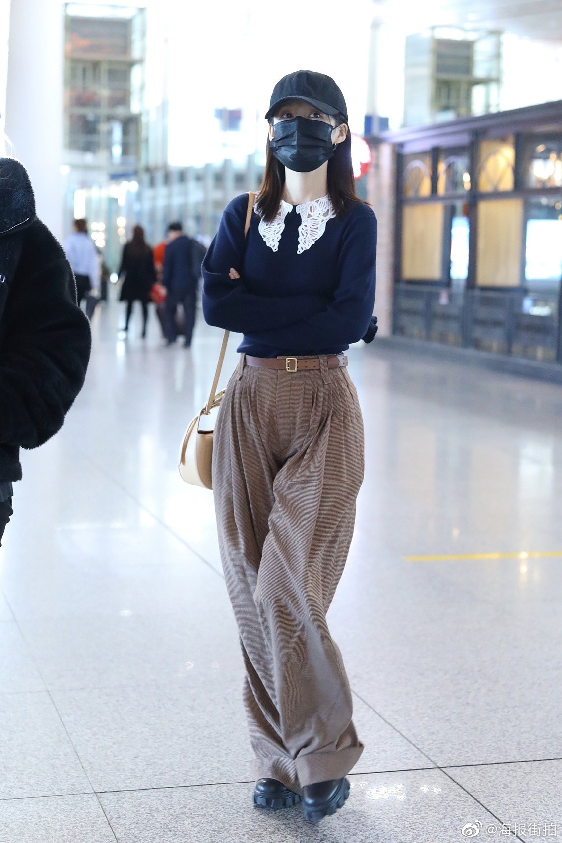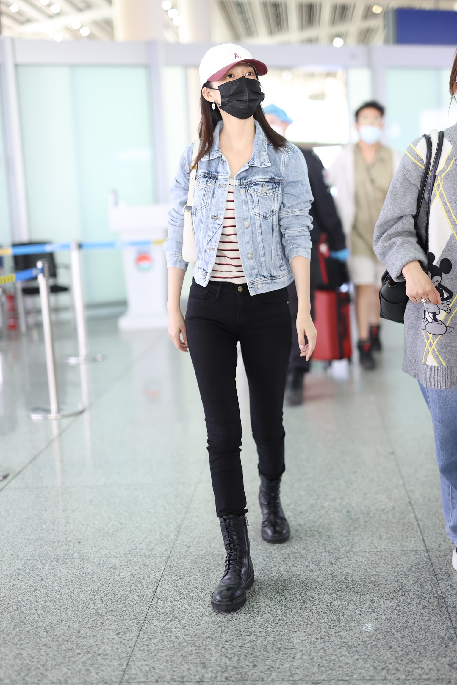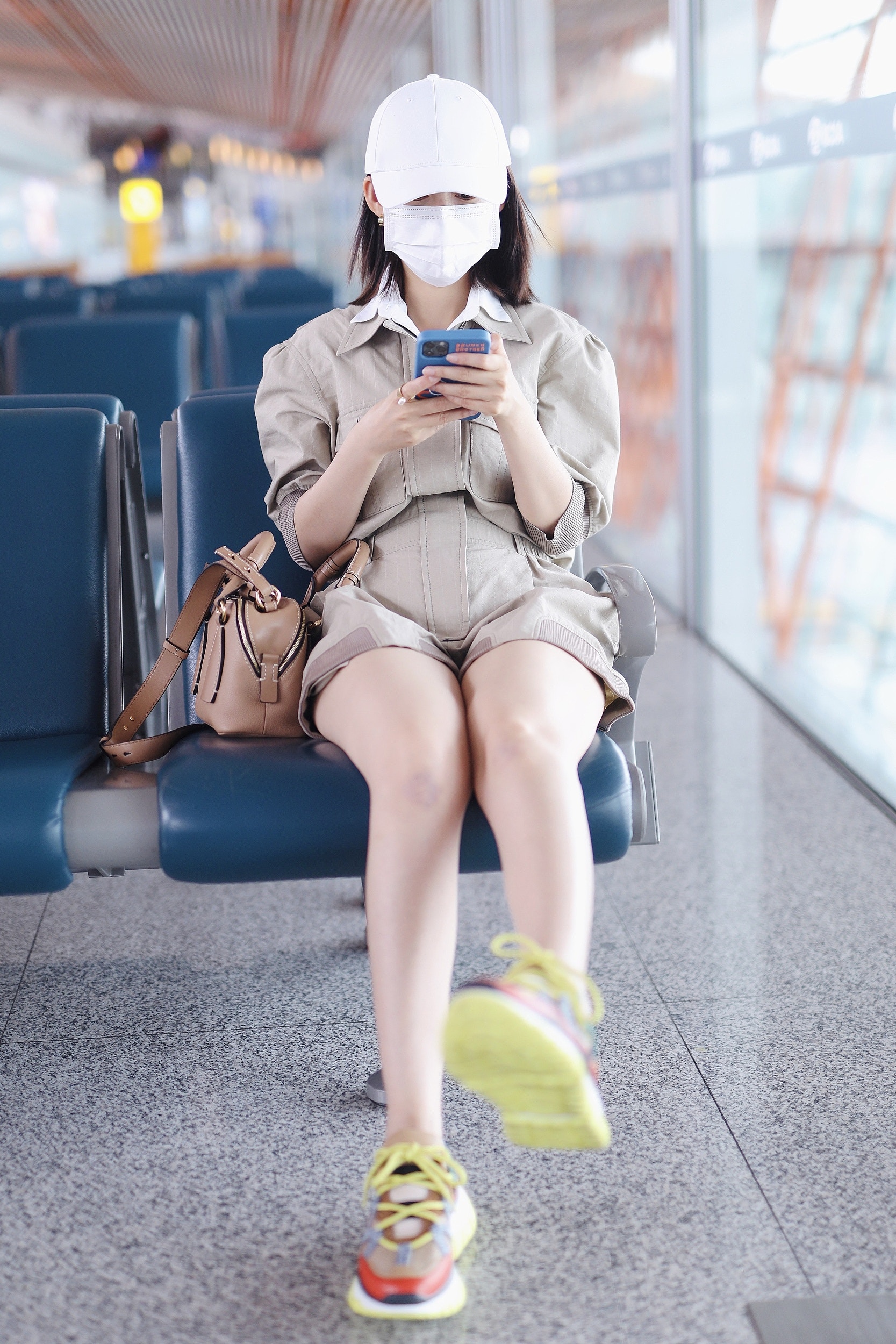 李沁在上海機場現身,示範優雅坐姿。(視覺中國)