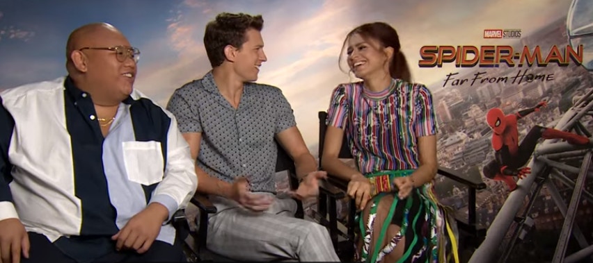 湯賀蘭與Zendaya和Jacob Batalon接受訪問。(影片截圖)