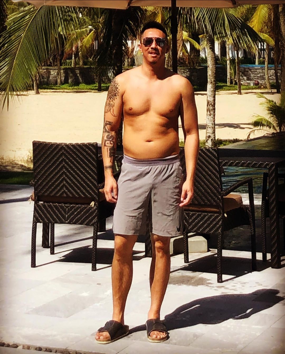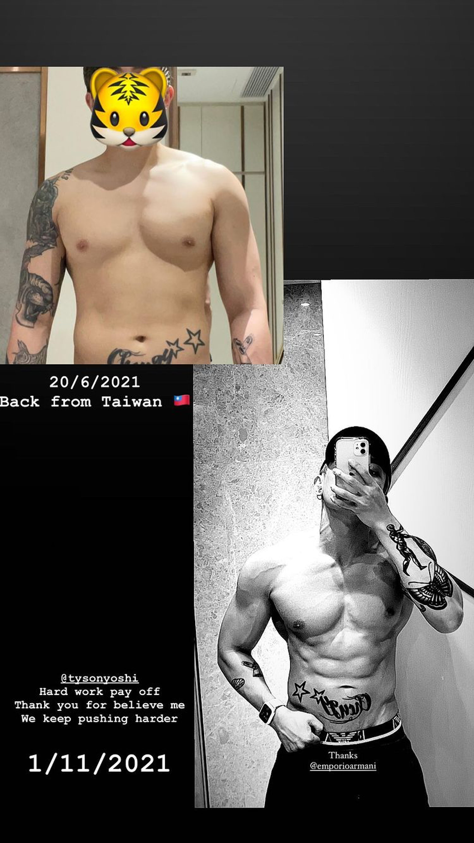 他的健身教練日前就上載了Tyson Yoshi今年6月時從台灣剛抵港的照片,可見Tyson Yoshi腰間有不少肥肉,經過5個月的時間,Tyson Yoshi已有極大轉變。(IG圖片)