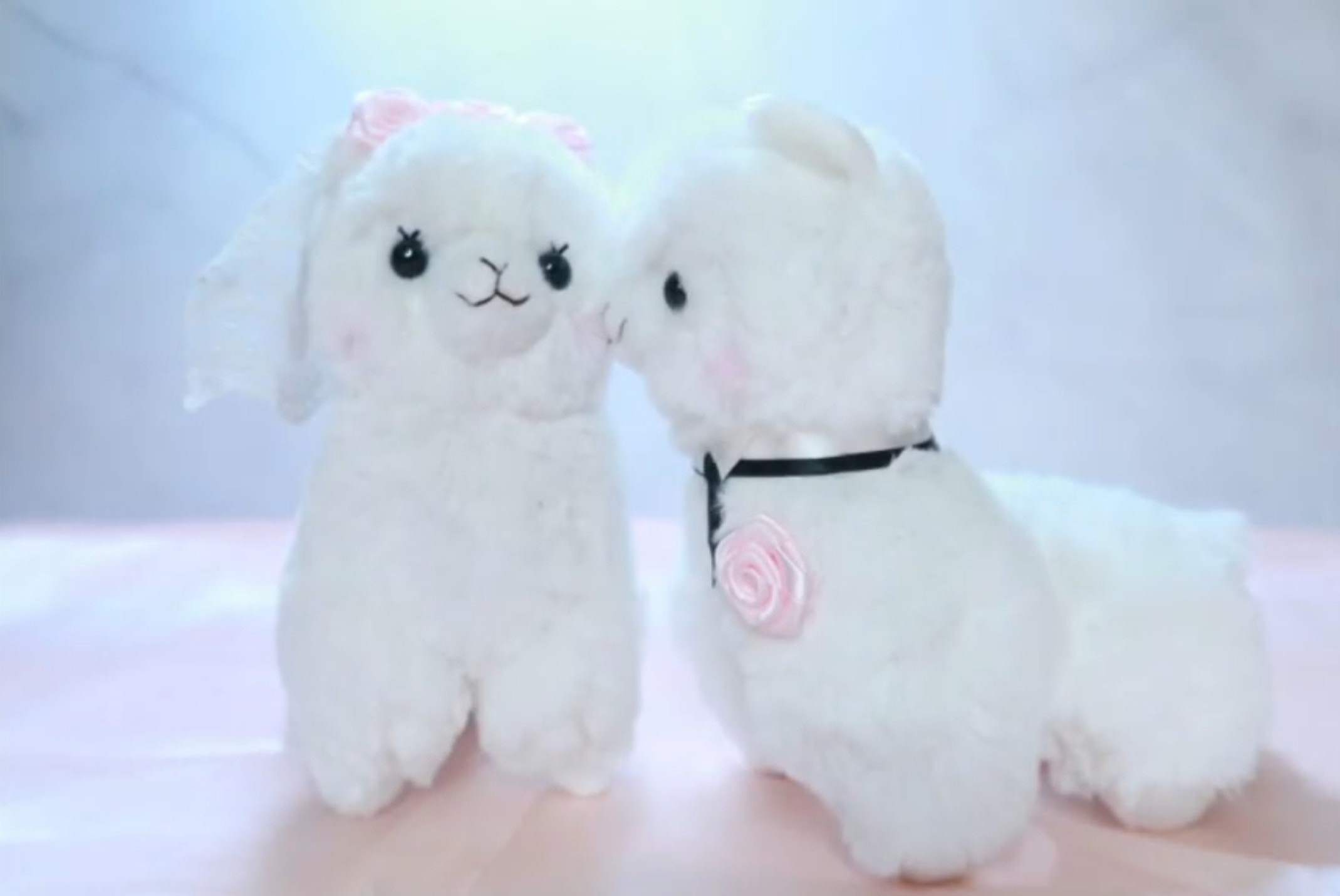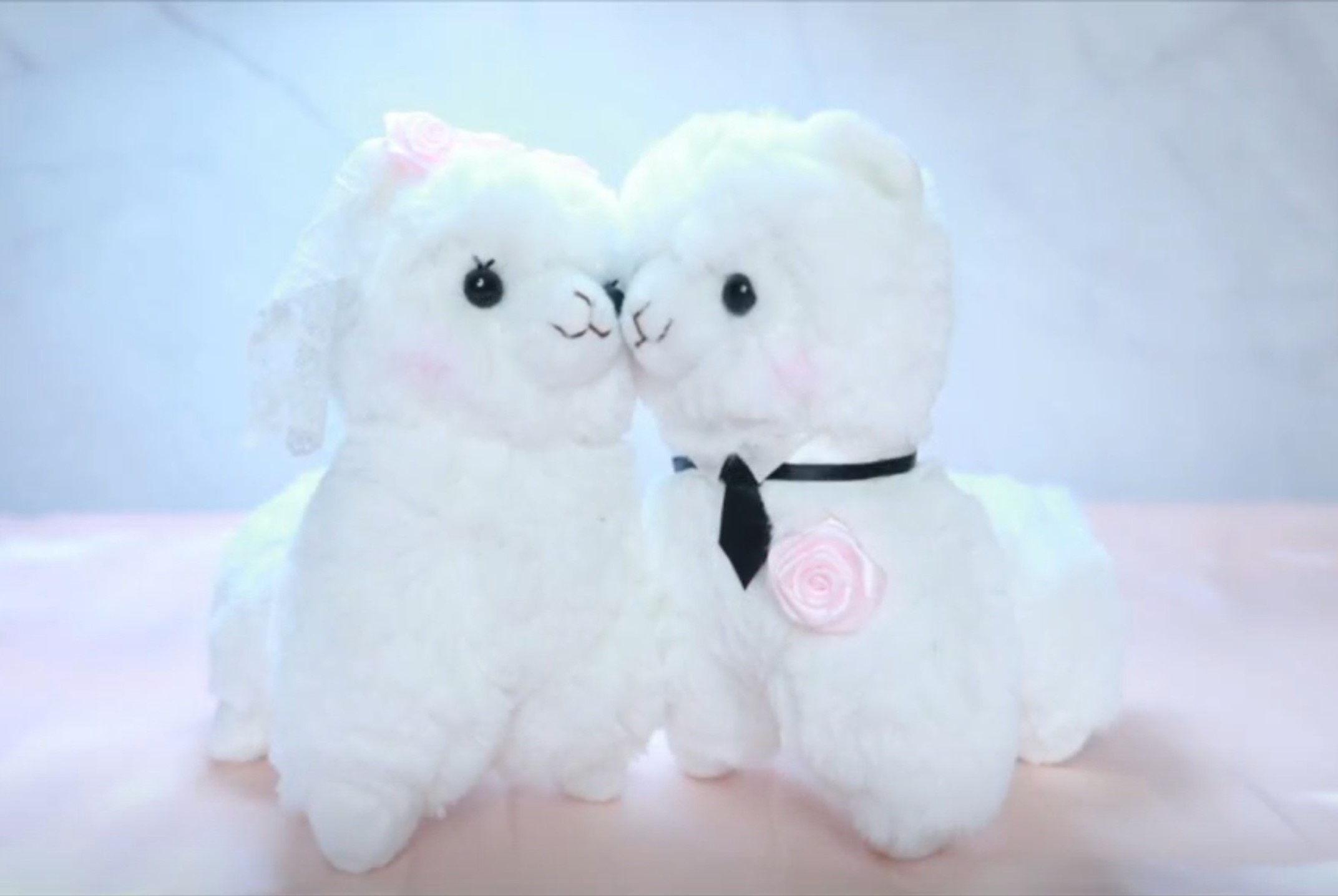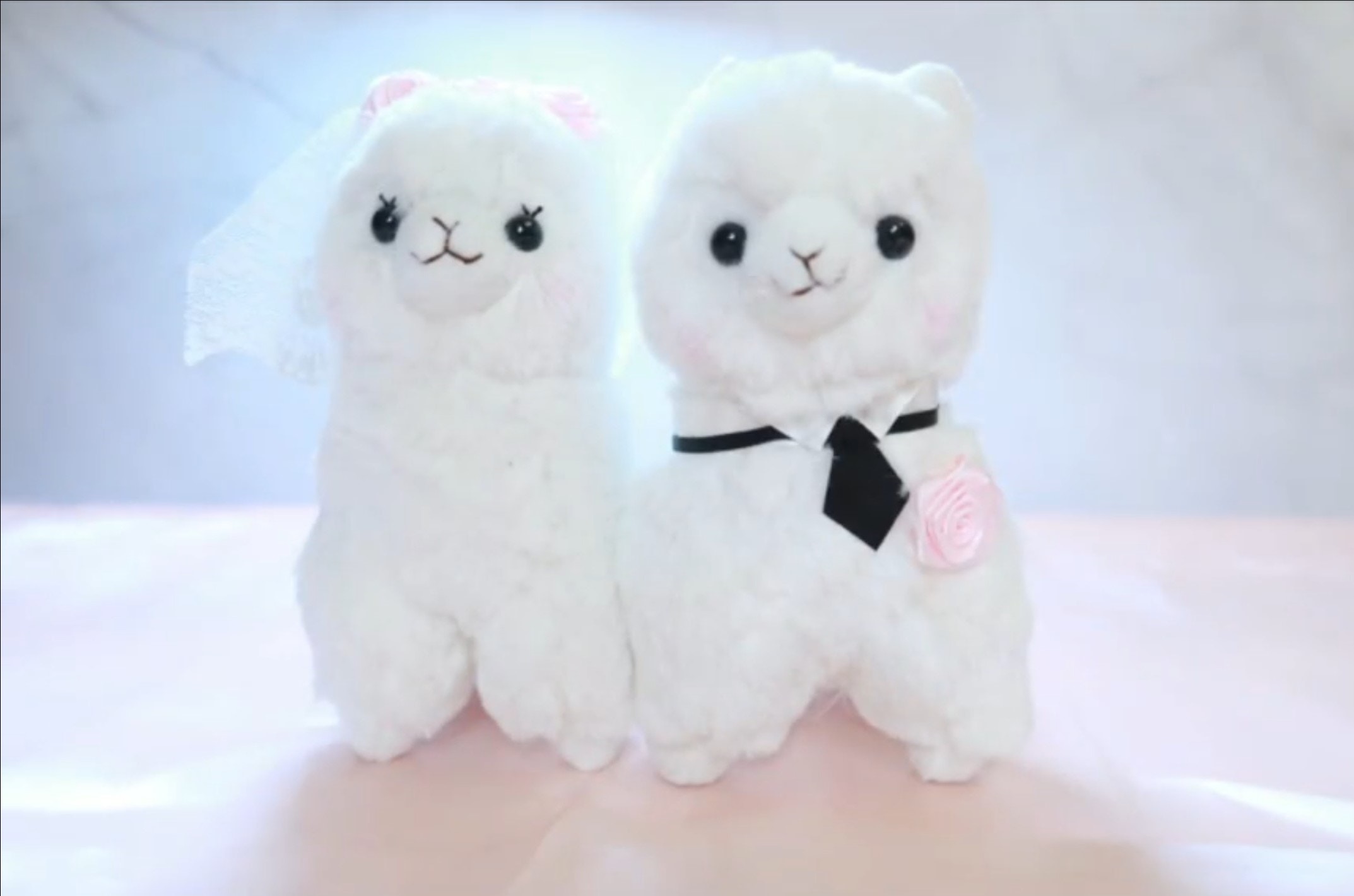 片中所見是一對分別以頭紗同領呔打扮的羊駝公仔,猶如一對新人一樣。(影片截圖)