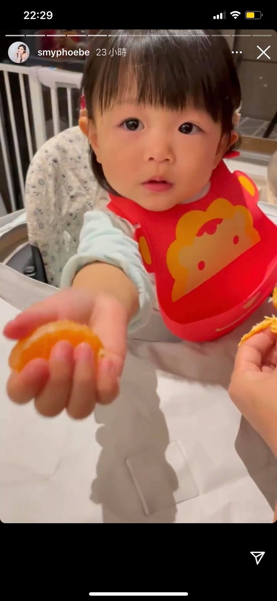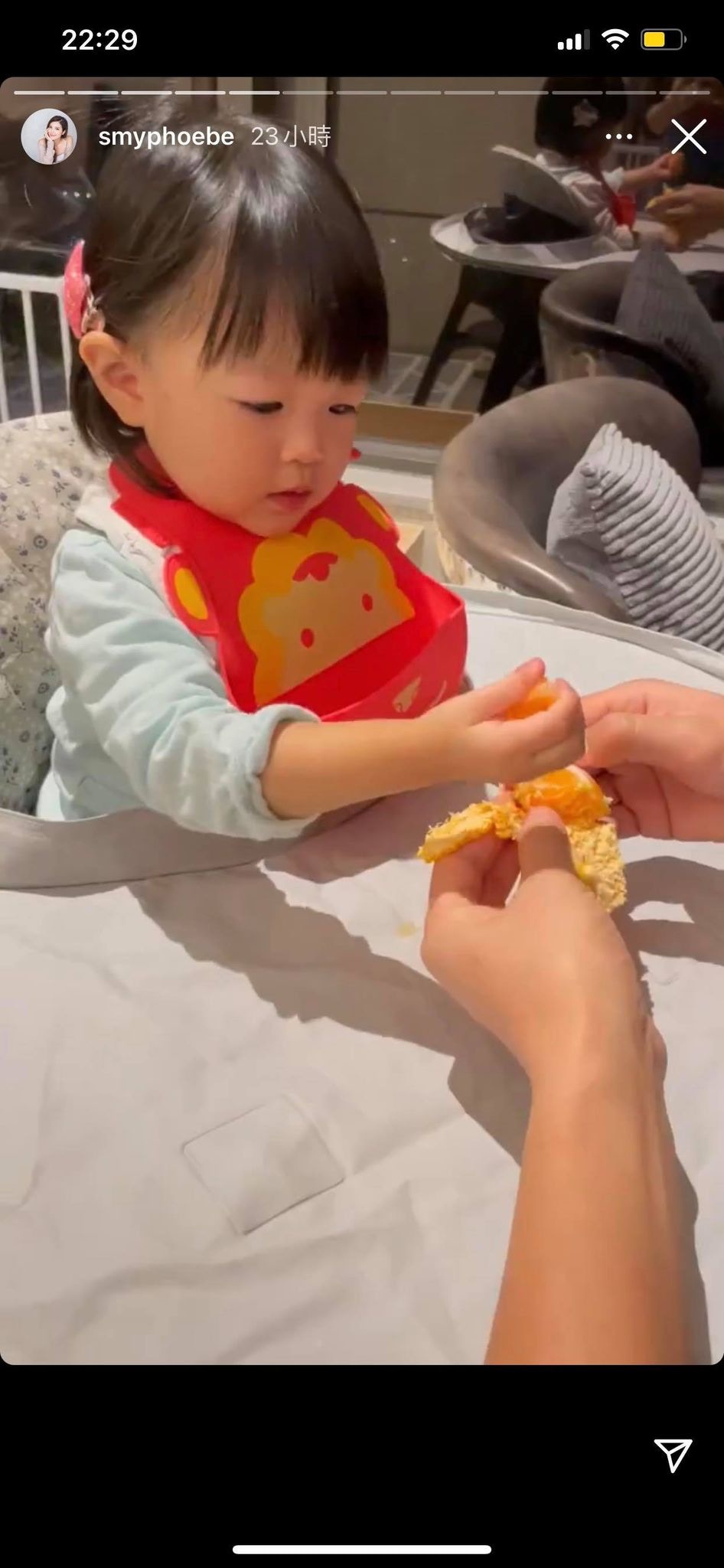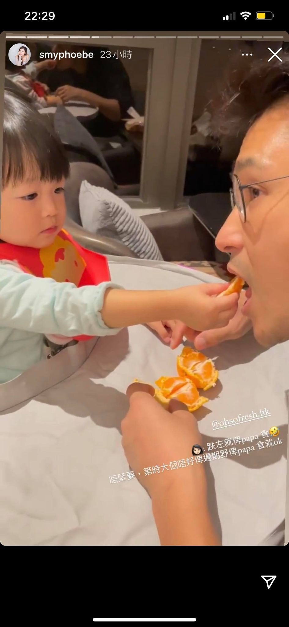 小豬比更親手餵爸爸食日本柑,冧到爸爸大讚小豬比:「好Sweet喎你!」(IG/@smyphoebe)