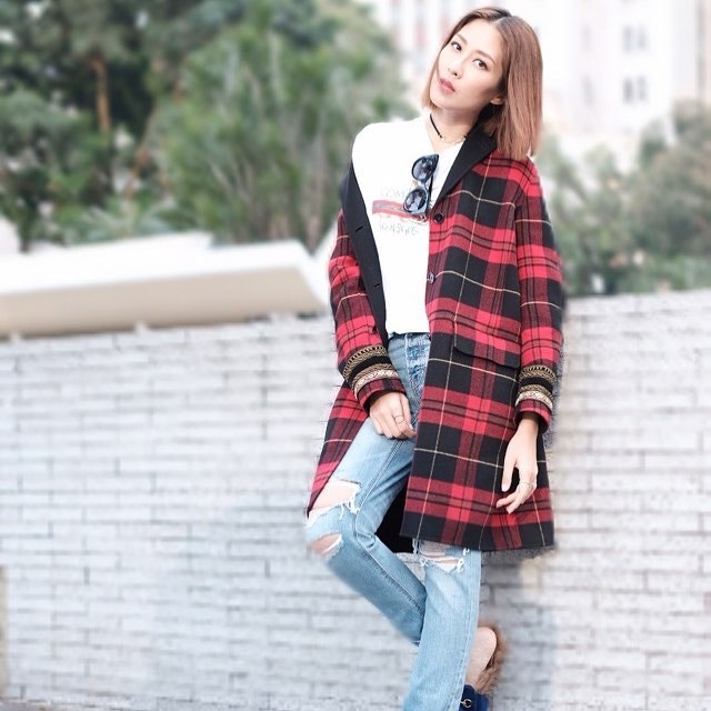 王君馨以紅色貼身圓領上衣配上百搭的牛仔褲,為沉穩中帶來驚喜。(gwgurlie86@Instagram)
