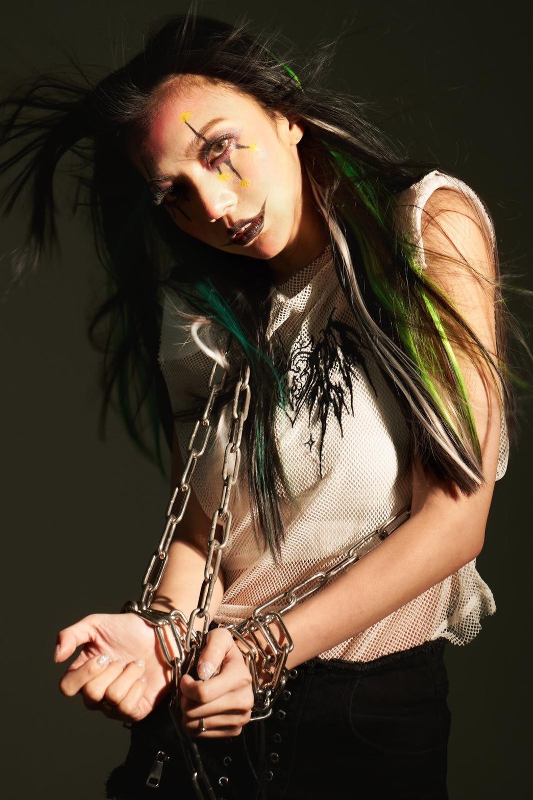 莉婭這次也配合老公,接上小丑的綠色挑染髮一起現身!曾經表演過水箱逃脫的莉婭對鐵鍊這道具一點也不陌生,綑綁自己之餘還乾脆拿來當作道具武器,她利用鐵鍊區隔原先小丑女偏柔弱的形象,順間升級為剛硬的女漢子,妝感上化妝師也特別畫上黑色口紅,讓她與小丑一起霸氣使壞!