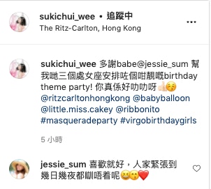Suki在帖文留言指「多謝babe@jessie_sum 幫我哋三個處女座安排咗個咁靚嘅birthday theme party! 你真係好叻叻呀」。(ig@sukichui_wee )