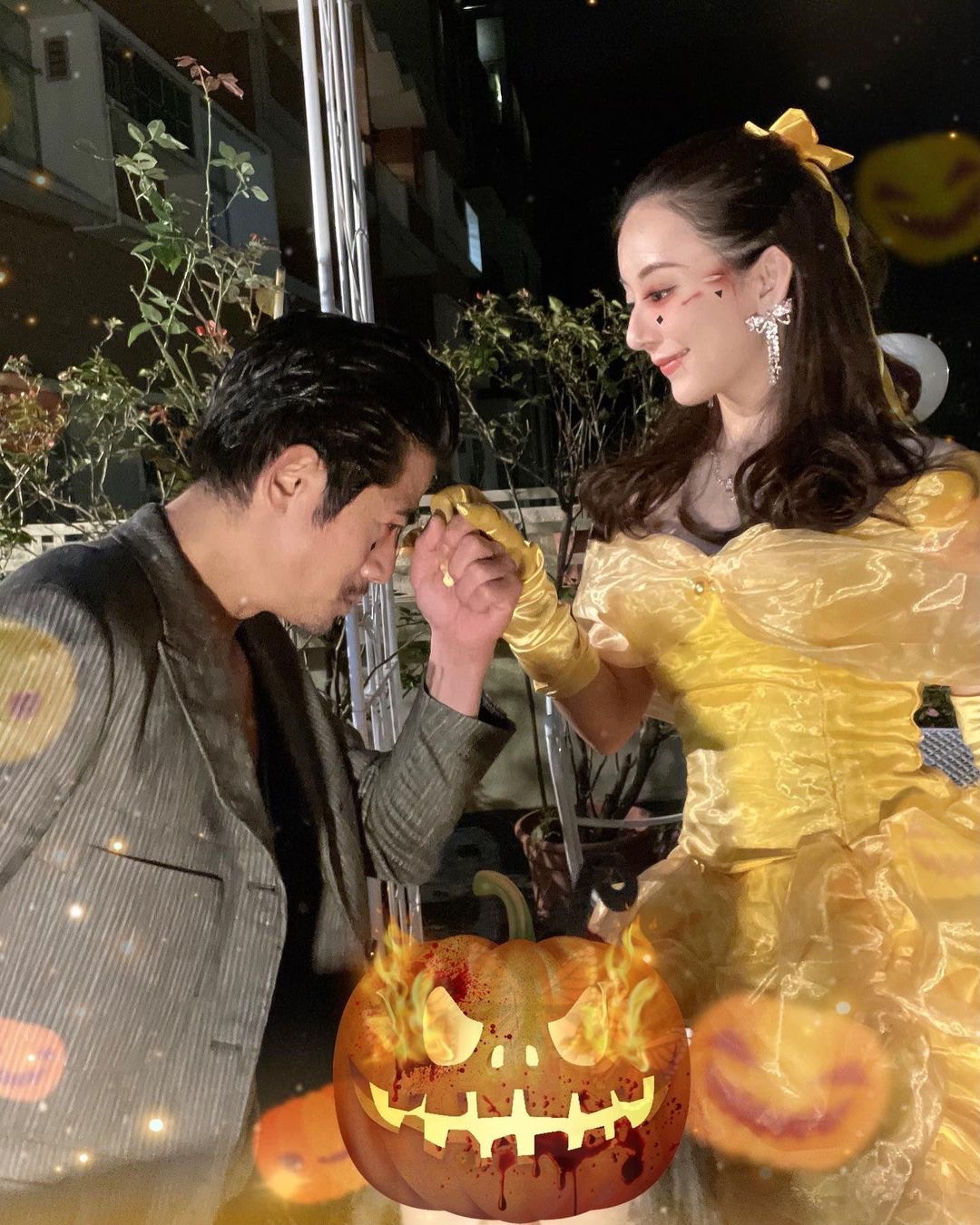 郭富城上月26日慶祝完56歲生日,與老婆方媛(Moka)襯紅色情侶裝, 前晚萬聖節城城一家人狂歡,今次輪到方媛做女主角,換上一套酷似《美女與野獸》貝兒的黃色晚裝,要城城單膝跪地。