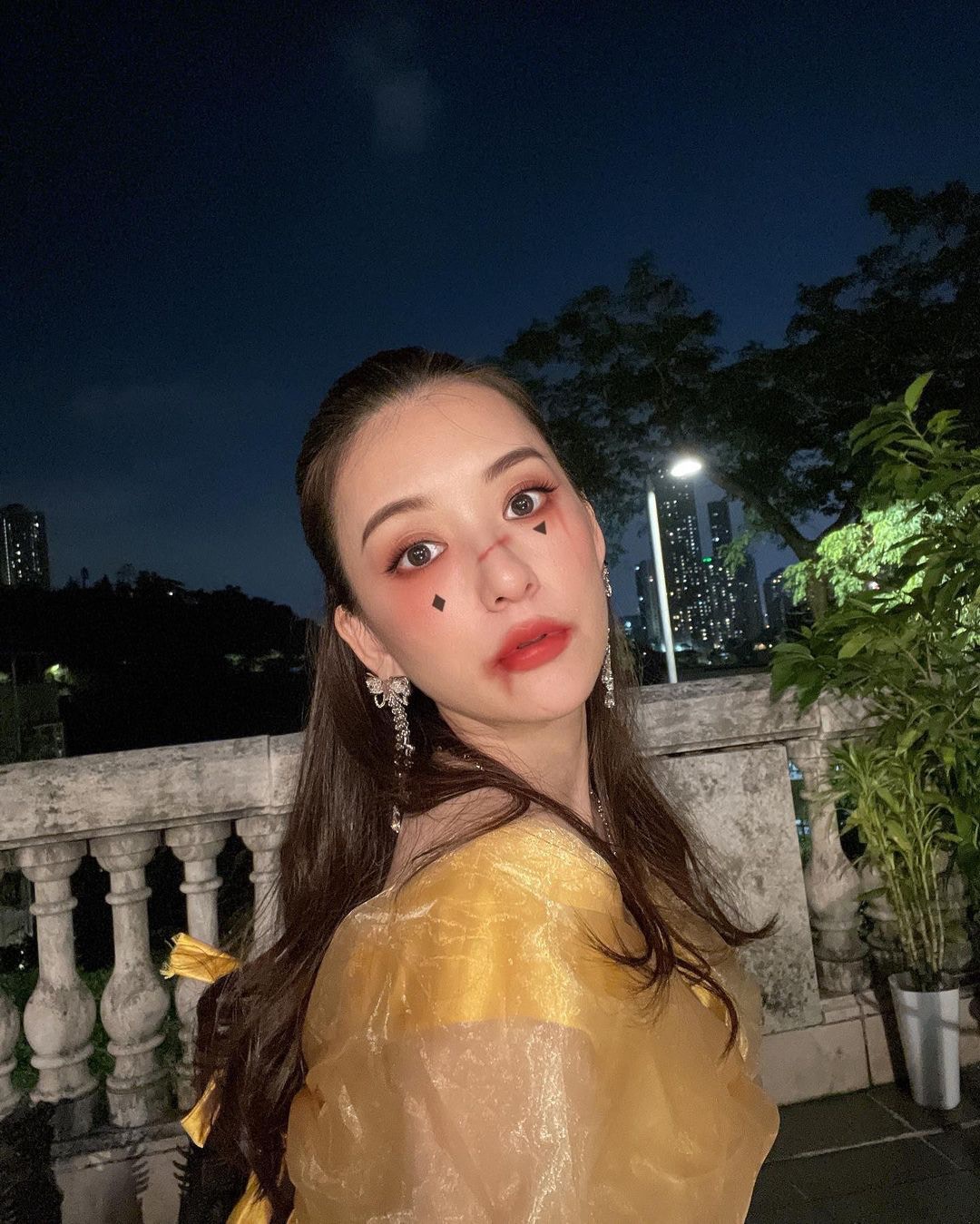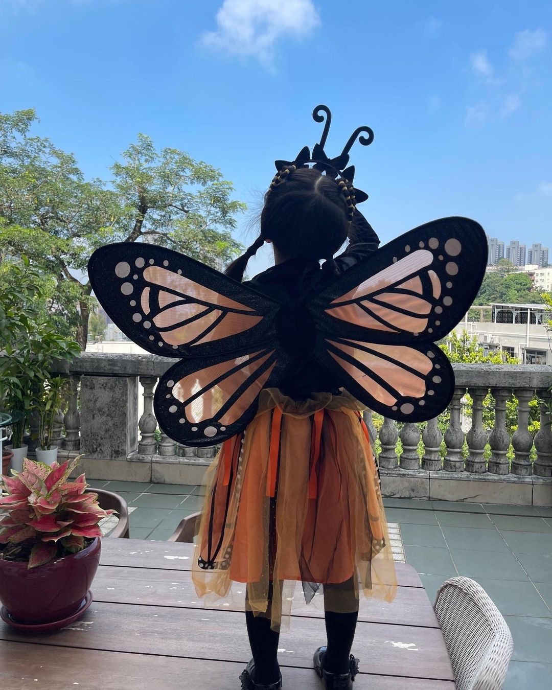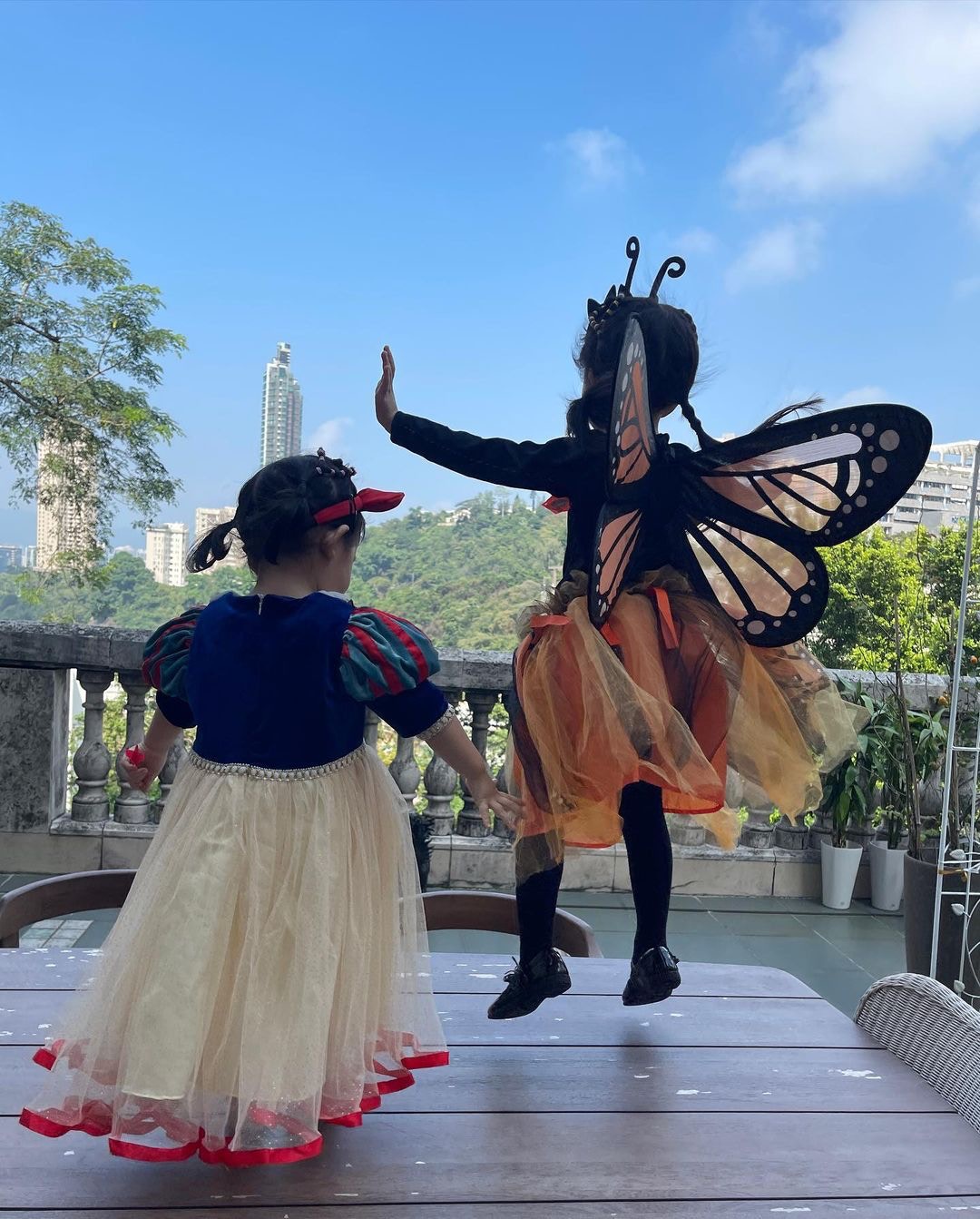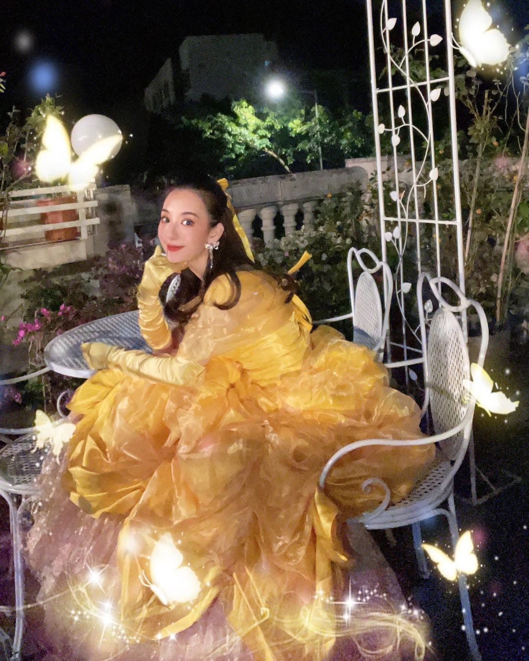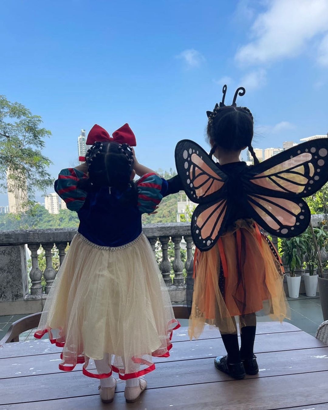 方媛昨晚在社交平台貼相,由日頭玩到夜晚。兩位囡囡分別扮白雪公主及蝴蝶在露台影相,晚上再在同一位置與城城重現《美女與野獸》場面。方媛這次除了貝兒打扮,又與女兒襯蝴蝶結耳環及頸鏈,可以做今年最靚萬聖節天王嫂。