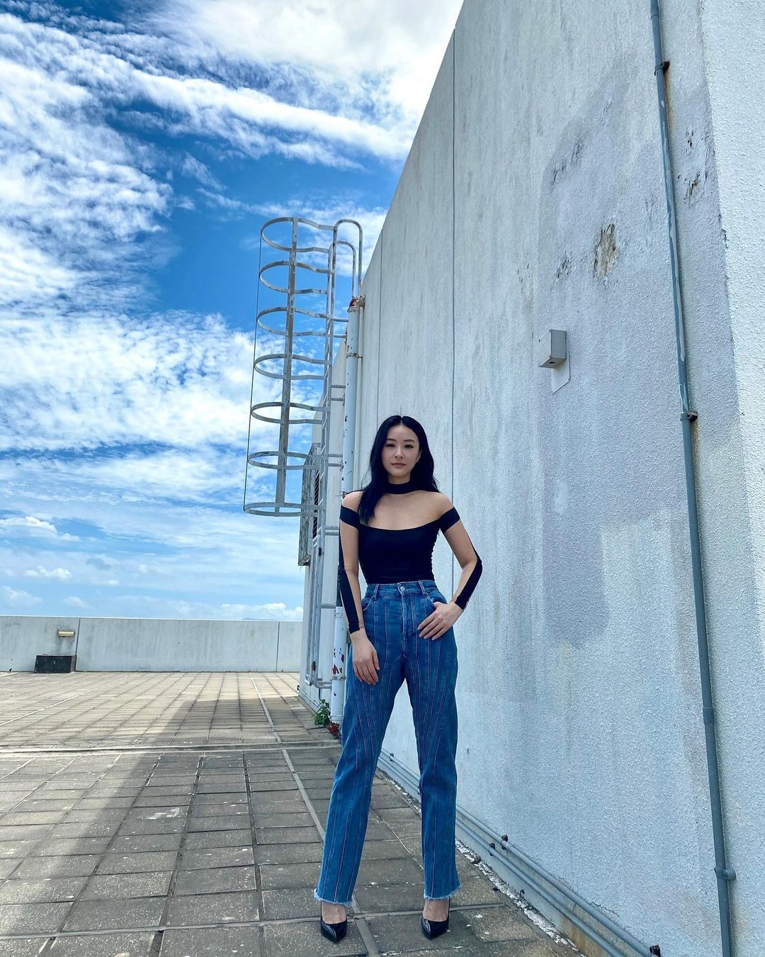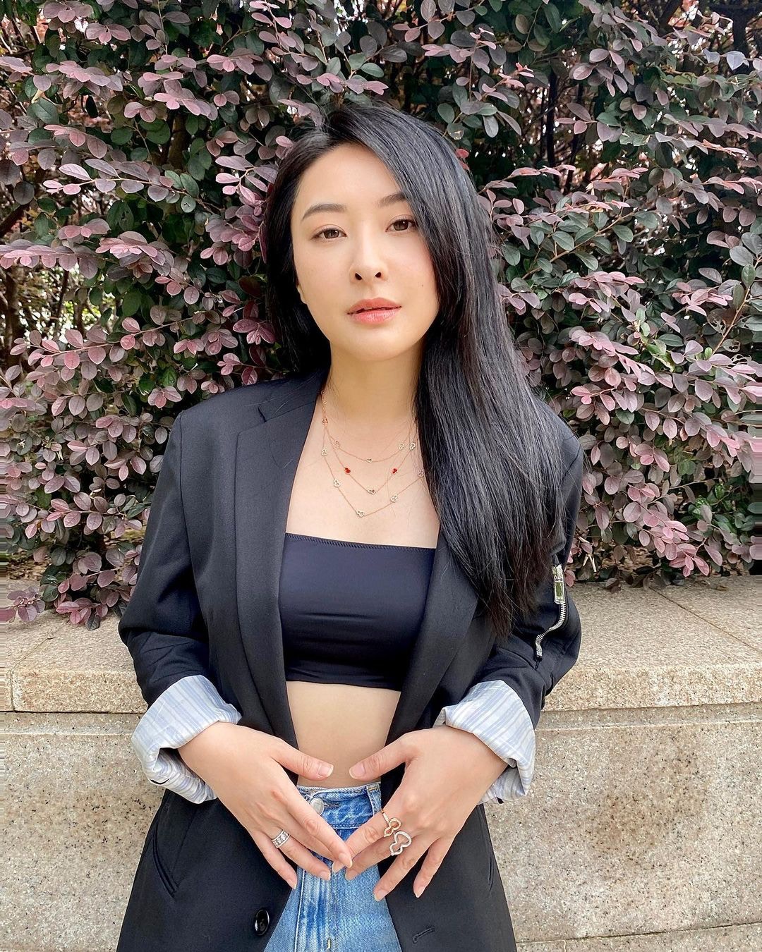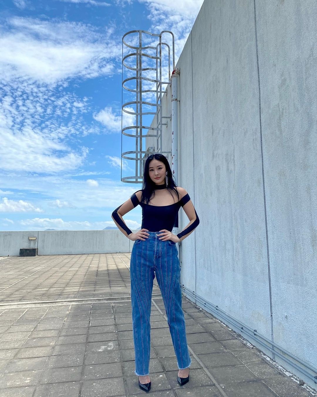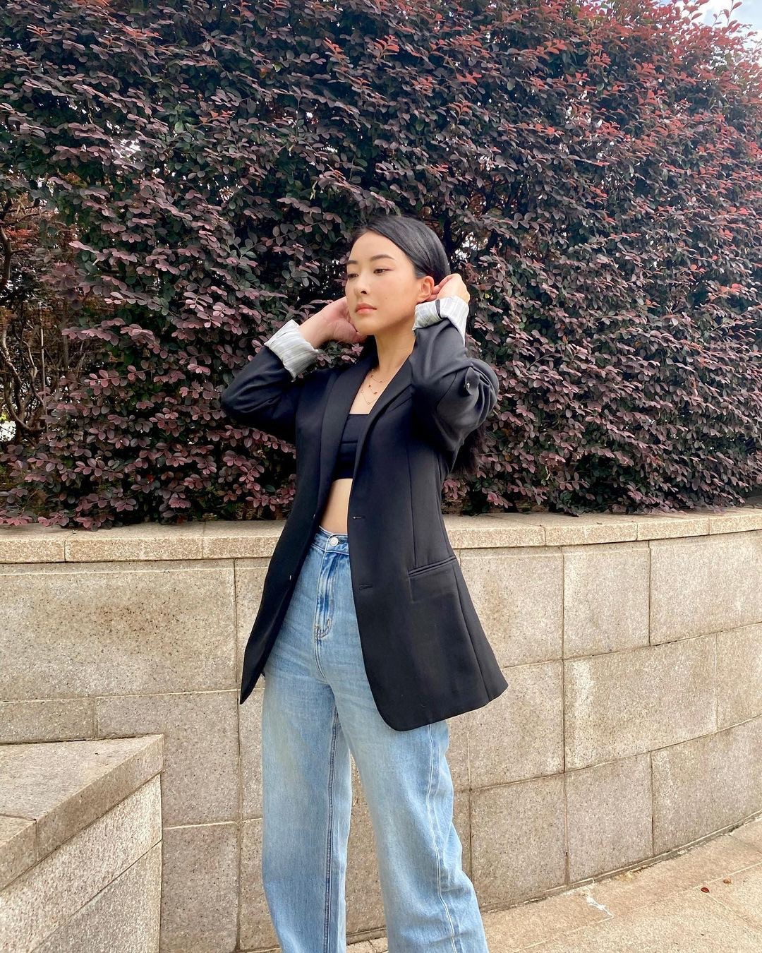 陳瀅穿上Tube Top加牛仔褲,再襯上西裝外套,打扮密實得來低調曬纖腰不失性感。(IG/ @missjni)
