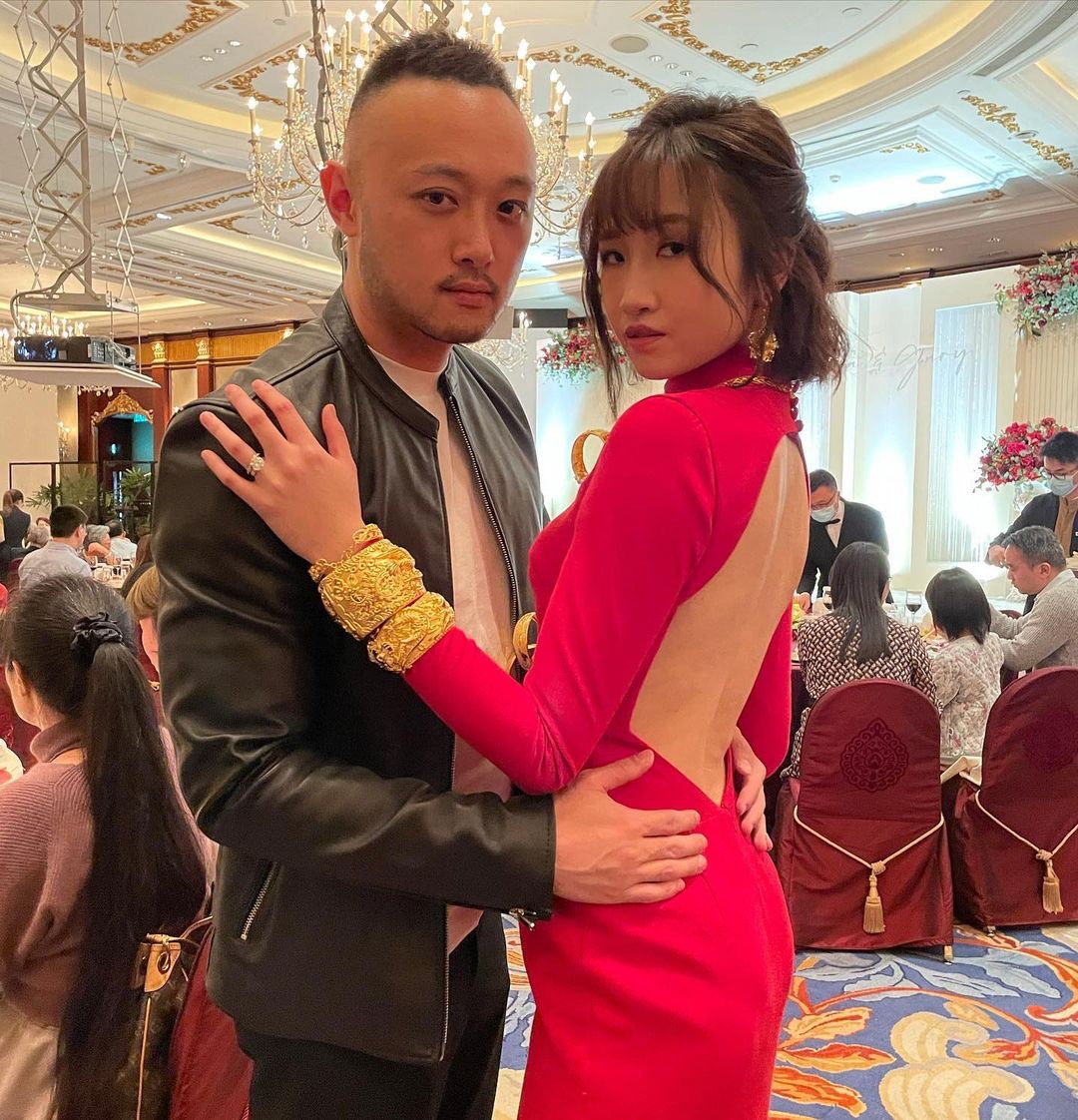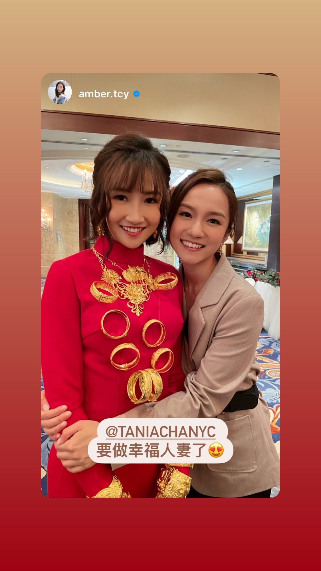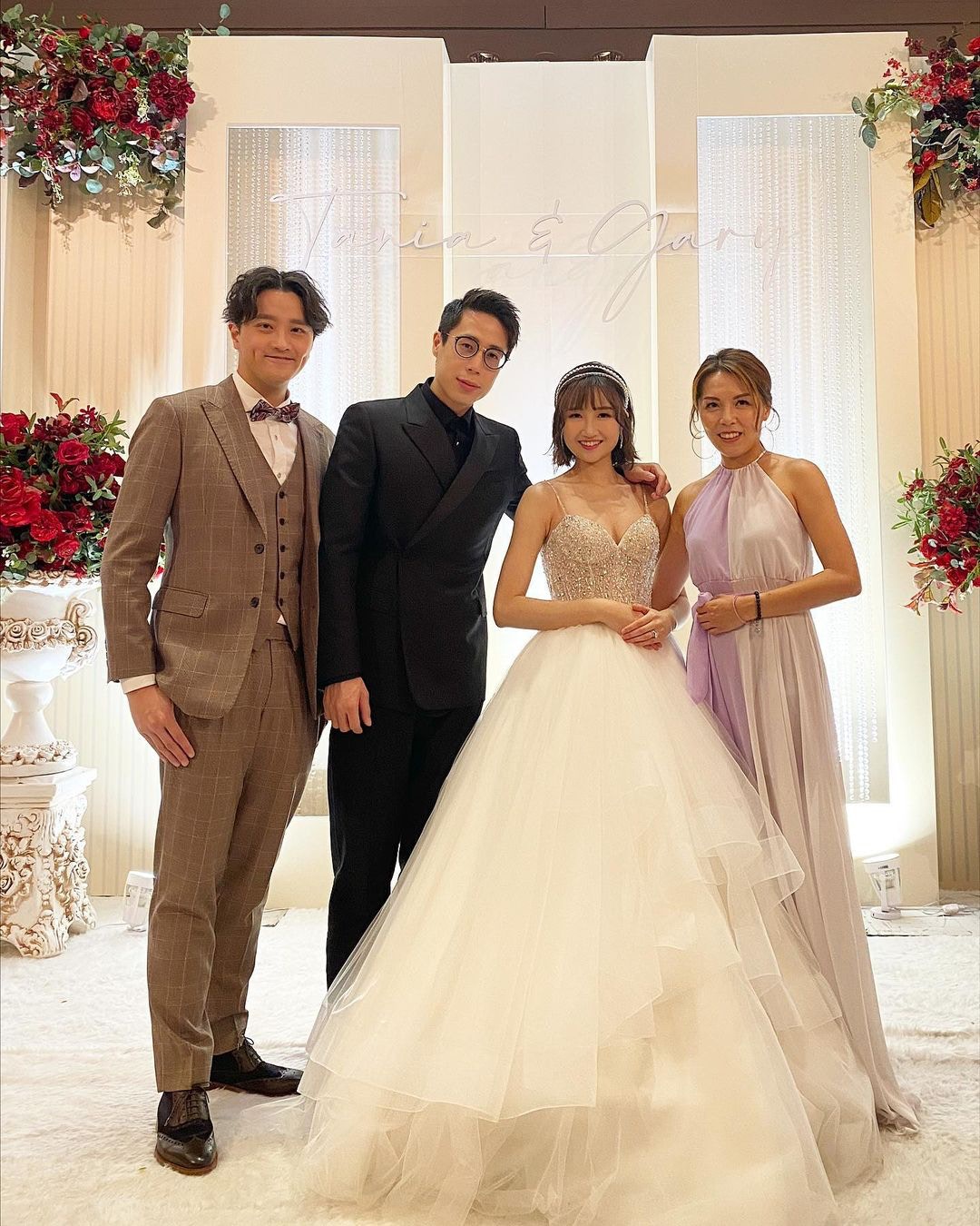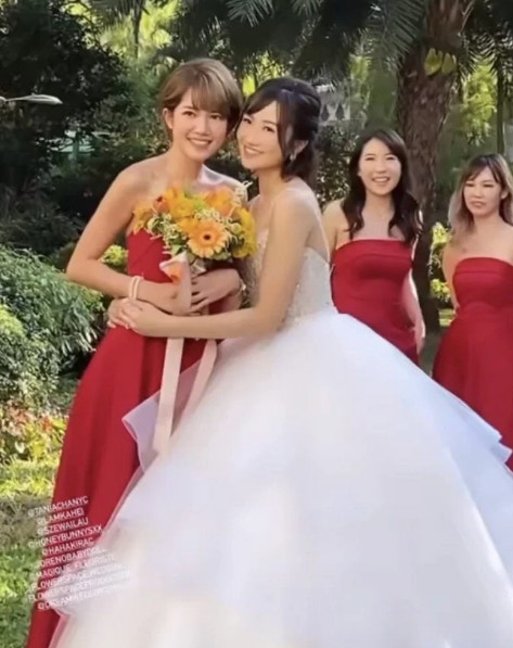 出門儀式姊妹團反傳統着粉紅色西裝,由Chloe成功接到花球,她輕鬆留言:「面對冷靜的姊妹團,唔小心搶到花球!」晚上婚宴Tania換上一件露背紅裙,戴到滿手金器,TVB好友劉佩玥、鄧卓殷都有出席,阿Moon感性向新娘子說:「我的小公主,雖然你結婚了,我依舊會守在你身旁,就算再忙,你一句話我就飛奔過來。」Tania忙完一晚,昨日才有時間洗板式在社交平台轉載嘉賓的合照,大晒幸福。