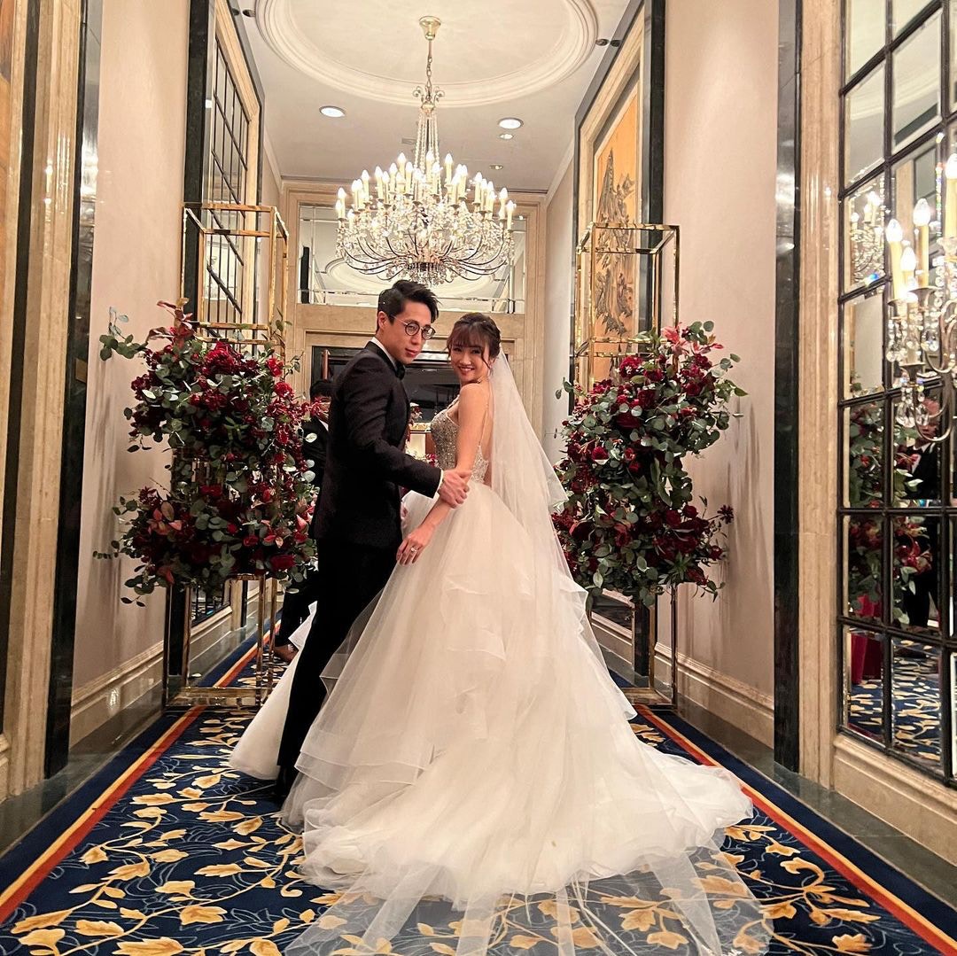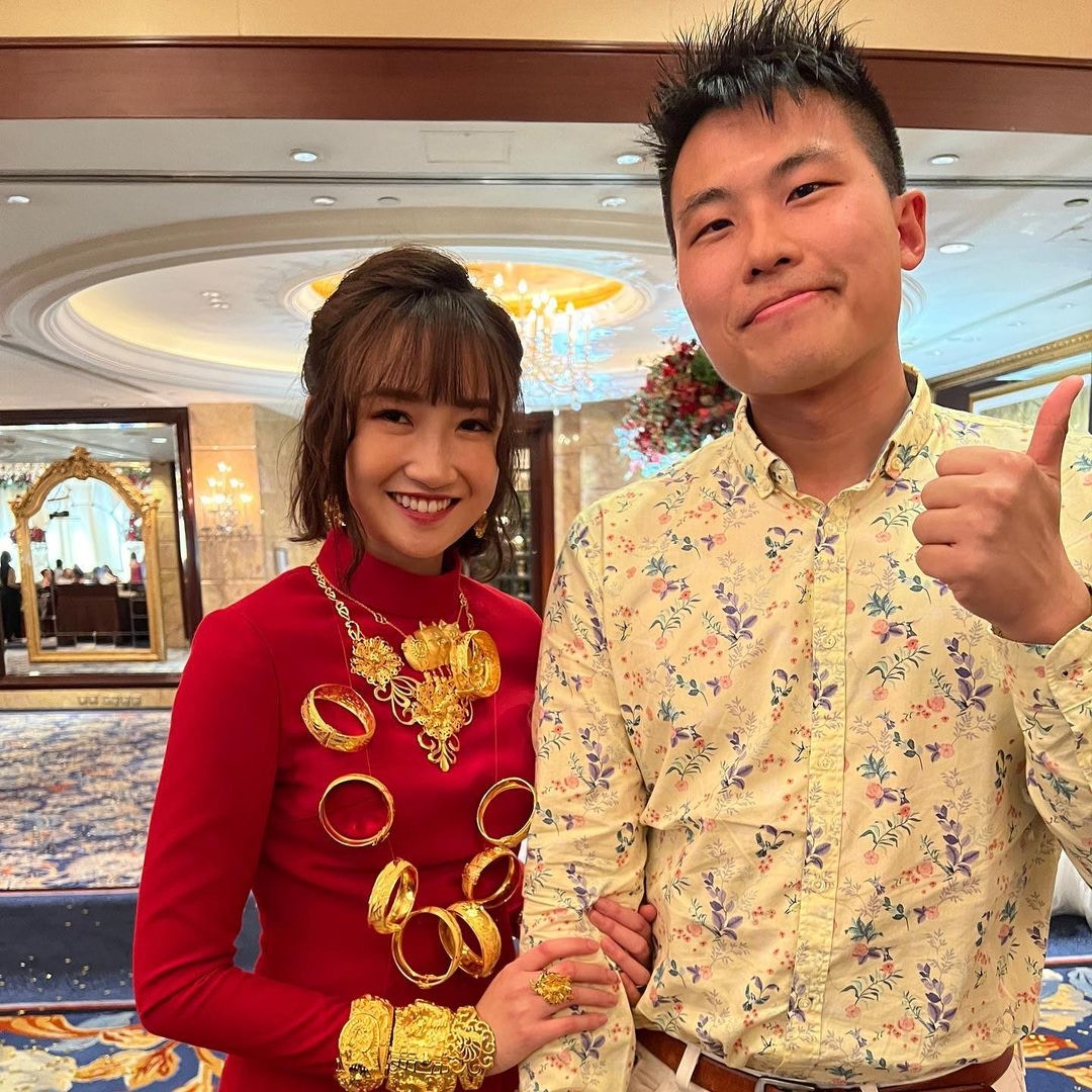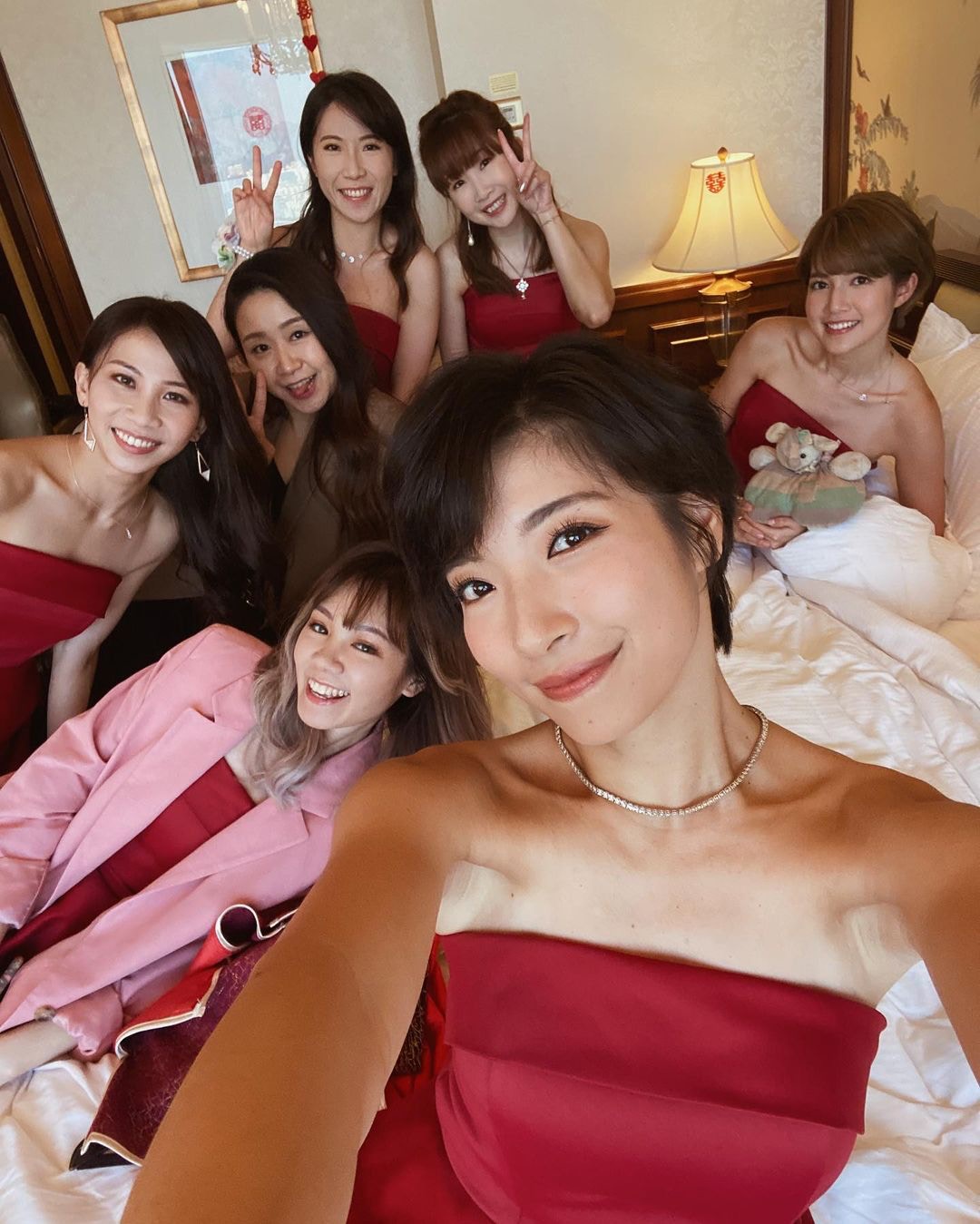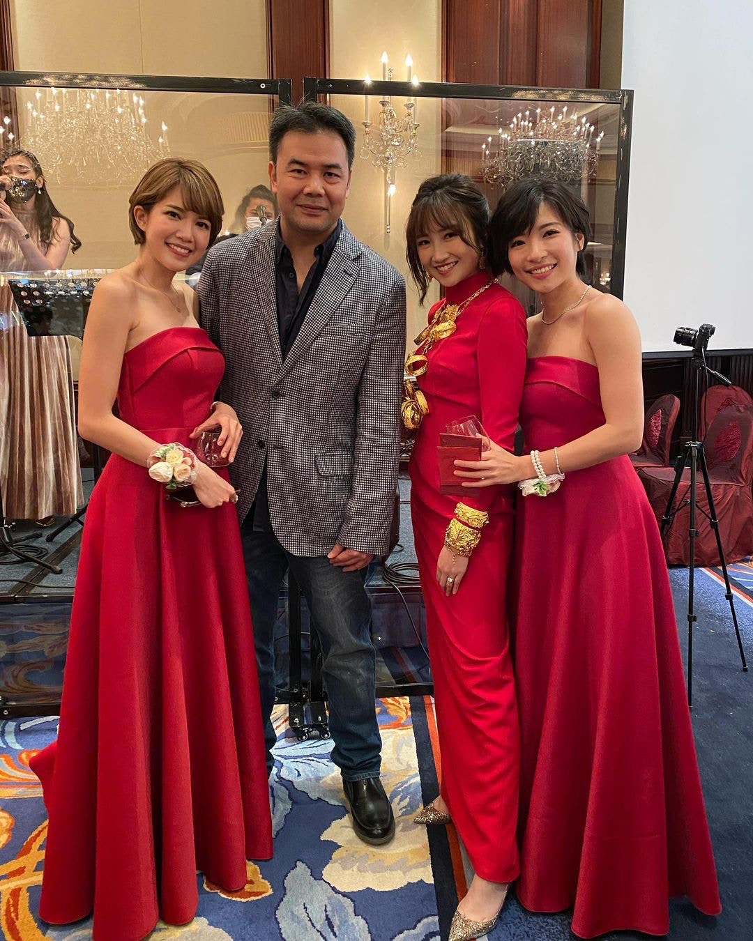 出門儀式姊妹團反傳統着粉紅色西裝,由Chloe成功接到花球,她輕鬆留言:「面對冷靜的姊妹團,唔小心搶到花球!」晚上婚宴Tania換上一件露背紅裙,戴到滿手金器,TVB好友劉佩玥、鄧卓殷都有出席,阿Moon感性向新娘子說:「我的小公主,雖然你結婚了,我依舊會守在你身旁,就算再忙,你一句話我就飛奔過來。」Tania忙完一晚,昨日才有時間洗板式在社交平台轉載嘉賓的合照,大晒幸福。