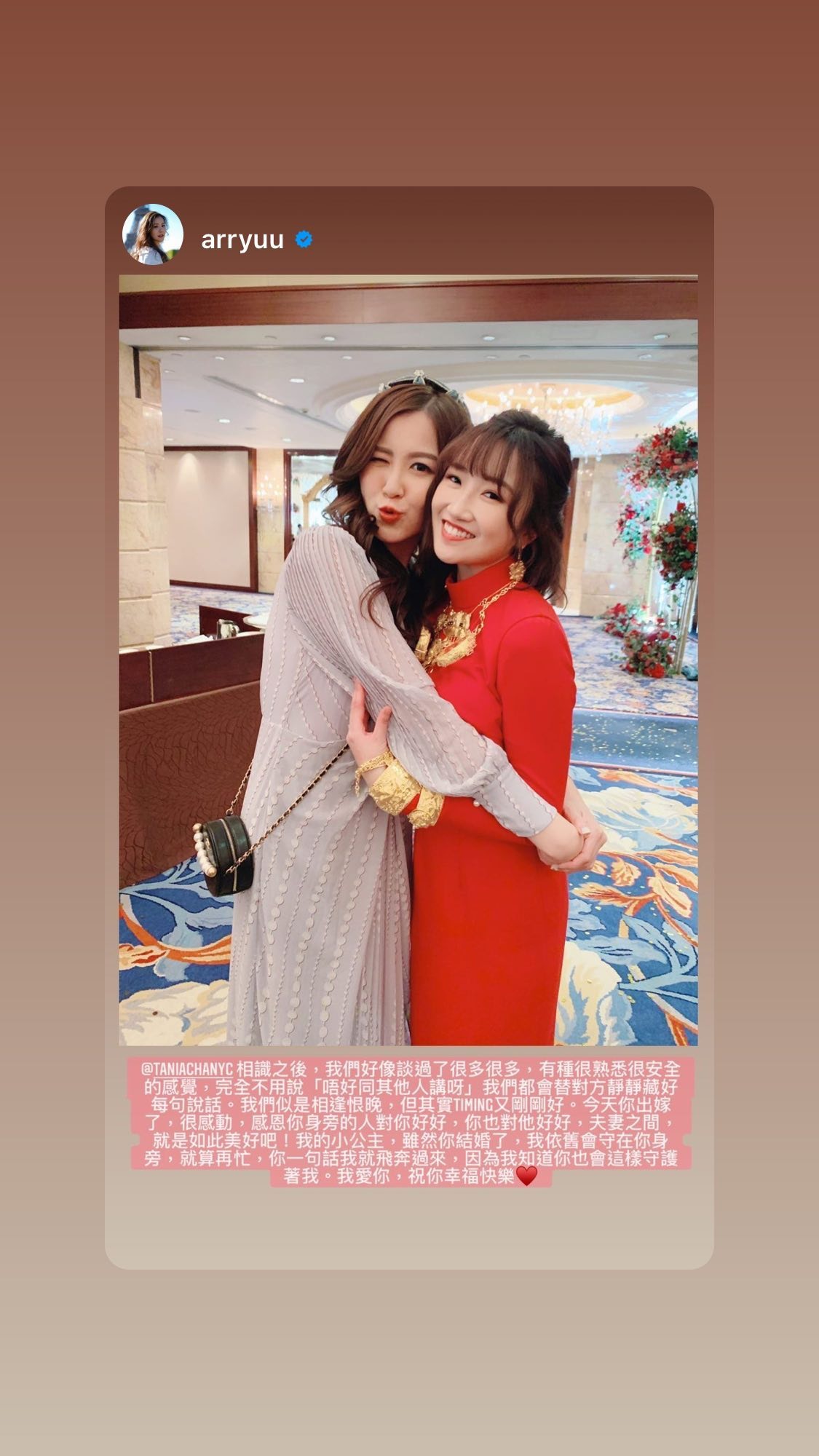 TVB好友鄧卓殷、劉佩玥出席婚宴,寫下感性留言。(IG圖片)