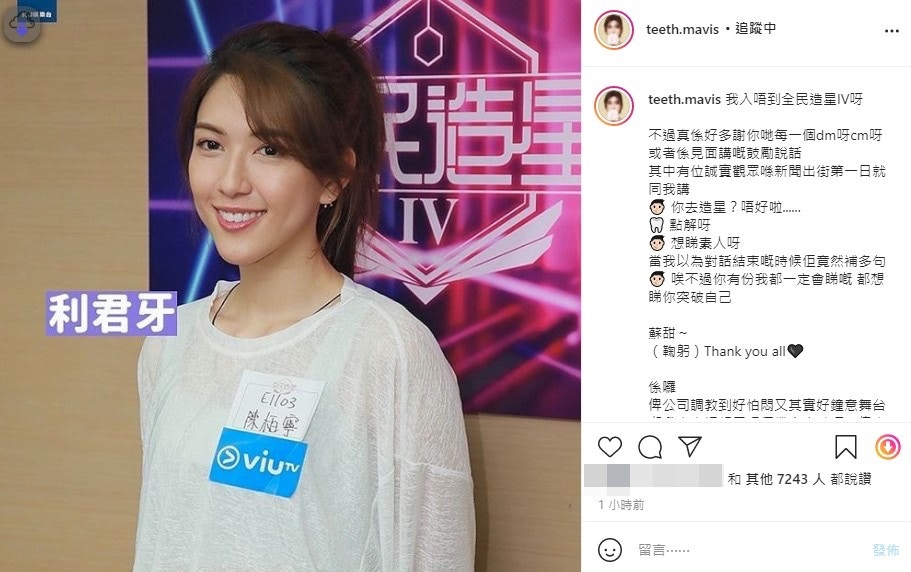 利君牙今日(1日)透露未能入選《全民造星4》。(IG@teeth.mavis)