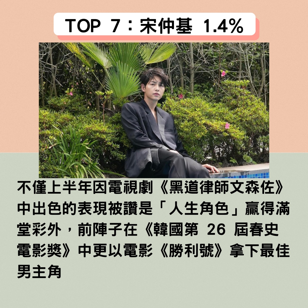 首先榮登上位圈的第一位就是以電視劇《黑道律師文森佐》回歸小螢幕的宋仲基,挺過離婚風波後的他,今年復出的成績可以說是相當出色,不僅上半年因電視劇《黑道律師文森佐》中出色的表現被讚是「人生角色」贏得滿堂彩外,前陣子在《韓國第 26 屆春史電影獎》中更以電影《勝利號》拿下最佳男主角,可見復出後成績不僅更加出色,未來也備受看好,近期也正在積極拍攝新劇《財閥家的小兒子》預計將在明年上半年與大家見面,屆時記得準時收看唷!