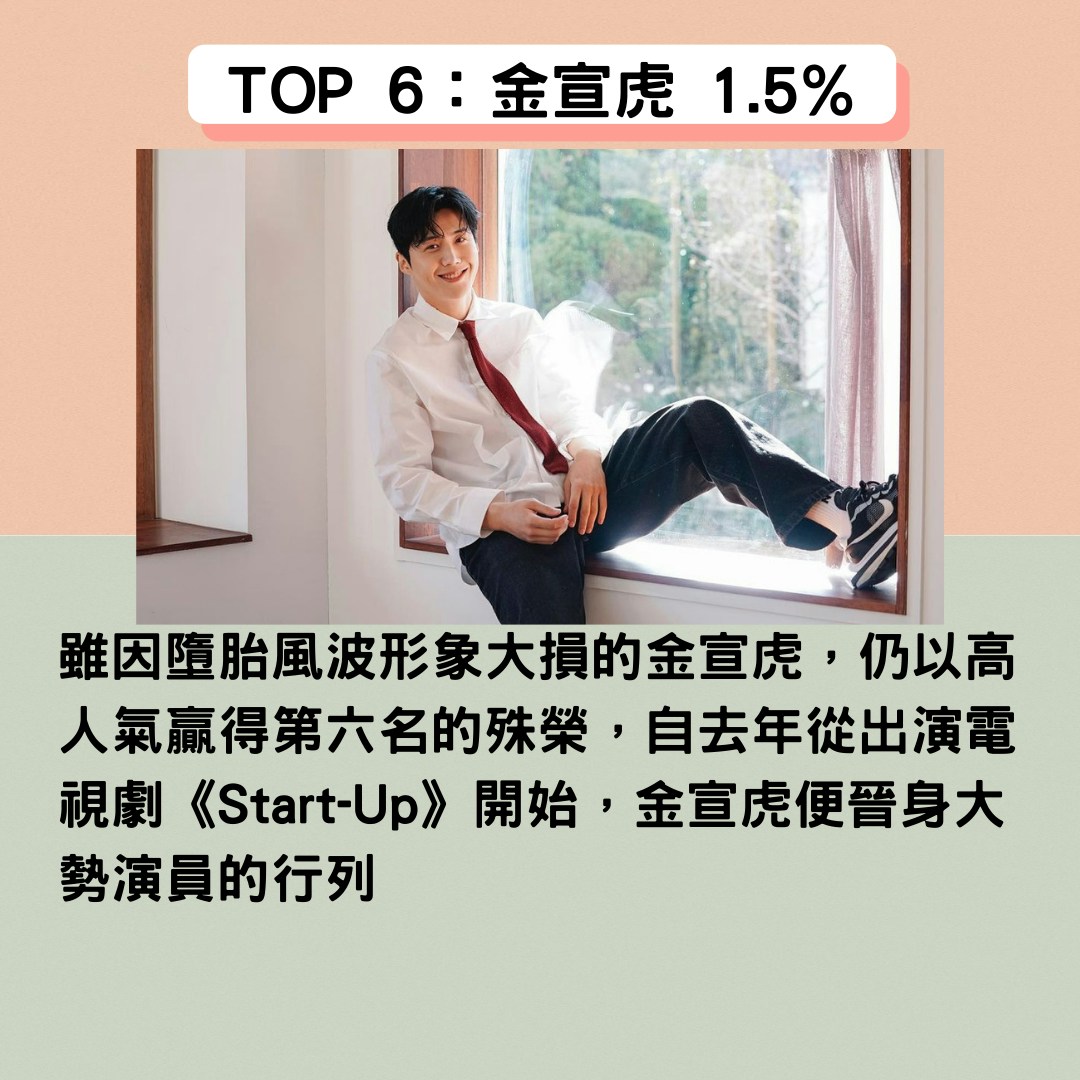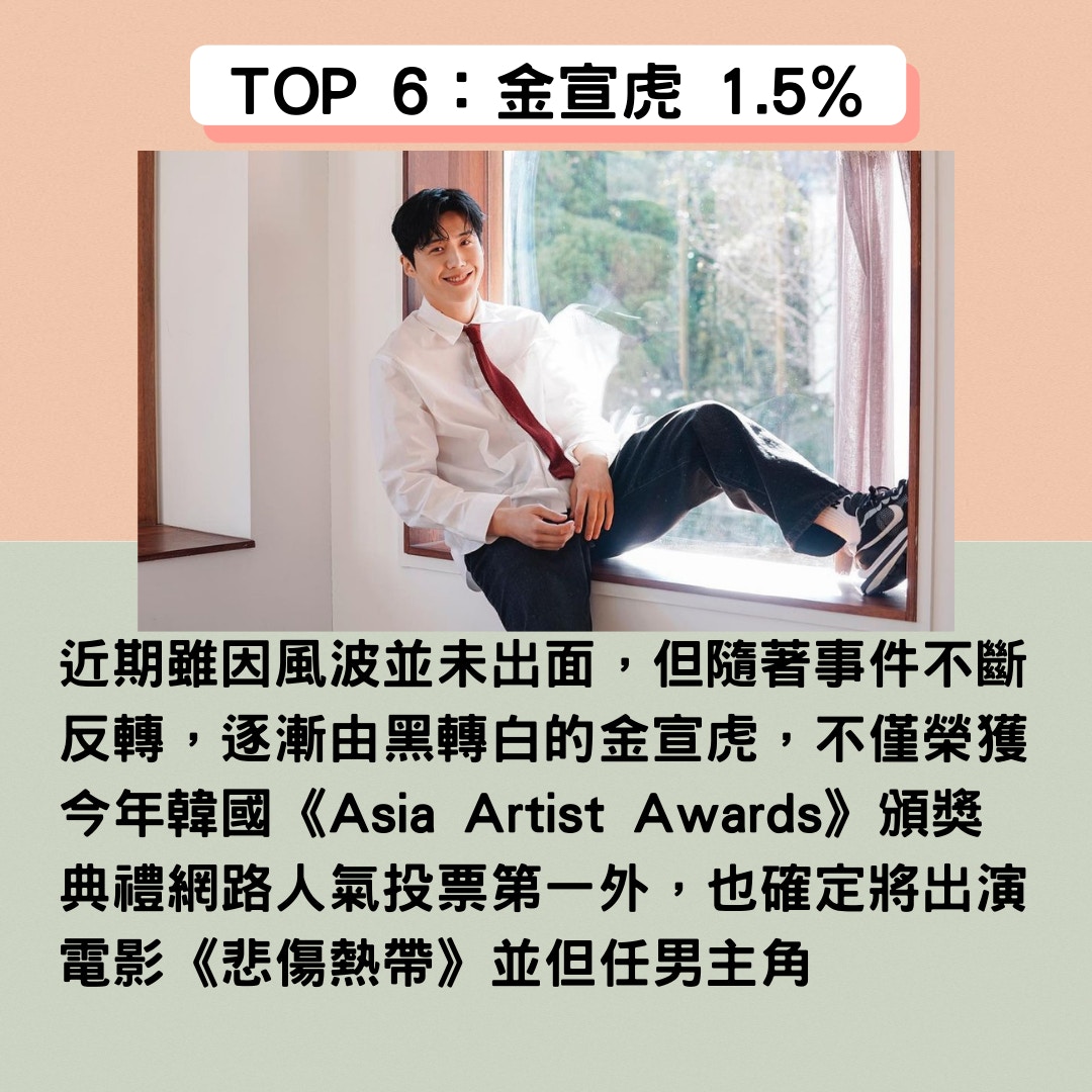 雖因墮胎風波形象大損的金宣虎,仍以高人氣贏得第六名的殊榮,自去年從出演電視劇《Start-Up》開始,金宣虎便晉身大勢演員的行列,今年更因《海岸村恰恰恰》而人氣暴漲,不僅演活了劇中「洪班長」一角,萬能溫暖的形象深植人心外,細膩深刻的演技更是備受觀眾好評,近期雖因風波並未出面,但隨著事件不斷反轉,逐漸由黑轉白的金宣虎,不僅榮獲今年韓國《Asia Artist Awards》頒獎典禮網路人氣投票第一外,也確定將出演電影《悲傷熱帶》並但任男主角,而這也是金宣虎首部電影作品,敬請各位期待的同時,也祈禱金宣虎今後只走花路吧!