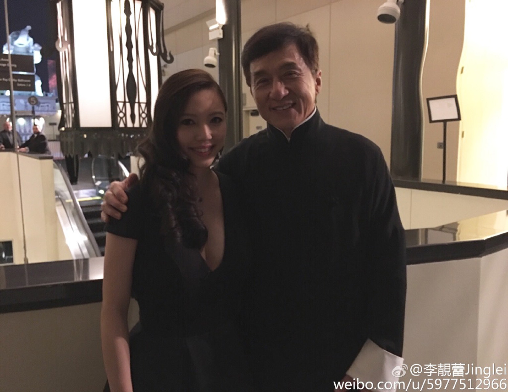 2016年11月14日,王力宏老婆李靓蕾在微博晒出与成龙的合照,配文称,“恭喜大哥成龙成为第一个获得奥斯卡终身成就奖的中国演员。”照片中,李靓蕾穿着一袭深V黑色礼服,大秀性感身材。图源:@李靚蕾Jinglei