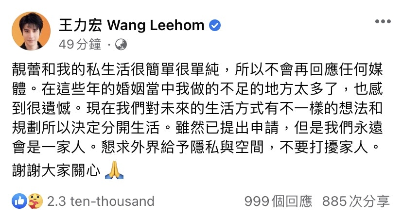 李靚蕾此貼文引來網民逾十多個留言,其中有網民就留言問李靚蕾「可以順便澄清一下當年Darwin的事情嗎?」而李靚蕾亦迅速親自回應對方表示:「訂婚新聞是誹謗」。據悉,Darwin是李靚蕾前男友,對方是一名律師,有傳當年她與王力宏結婚前,曾與這位前男友訂婚,沒想到不到1年的時間,她卻閃嫁了給王力宏,令Darwin難以接受,崩潰大哭。時隔多年竟有網友重提此事,李靚蕾即澄清當年的訂婚新聞是假的。