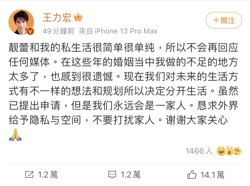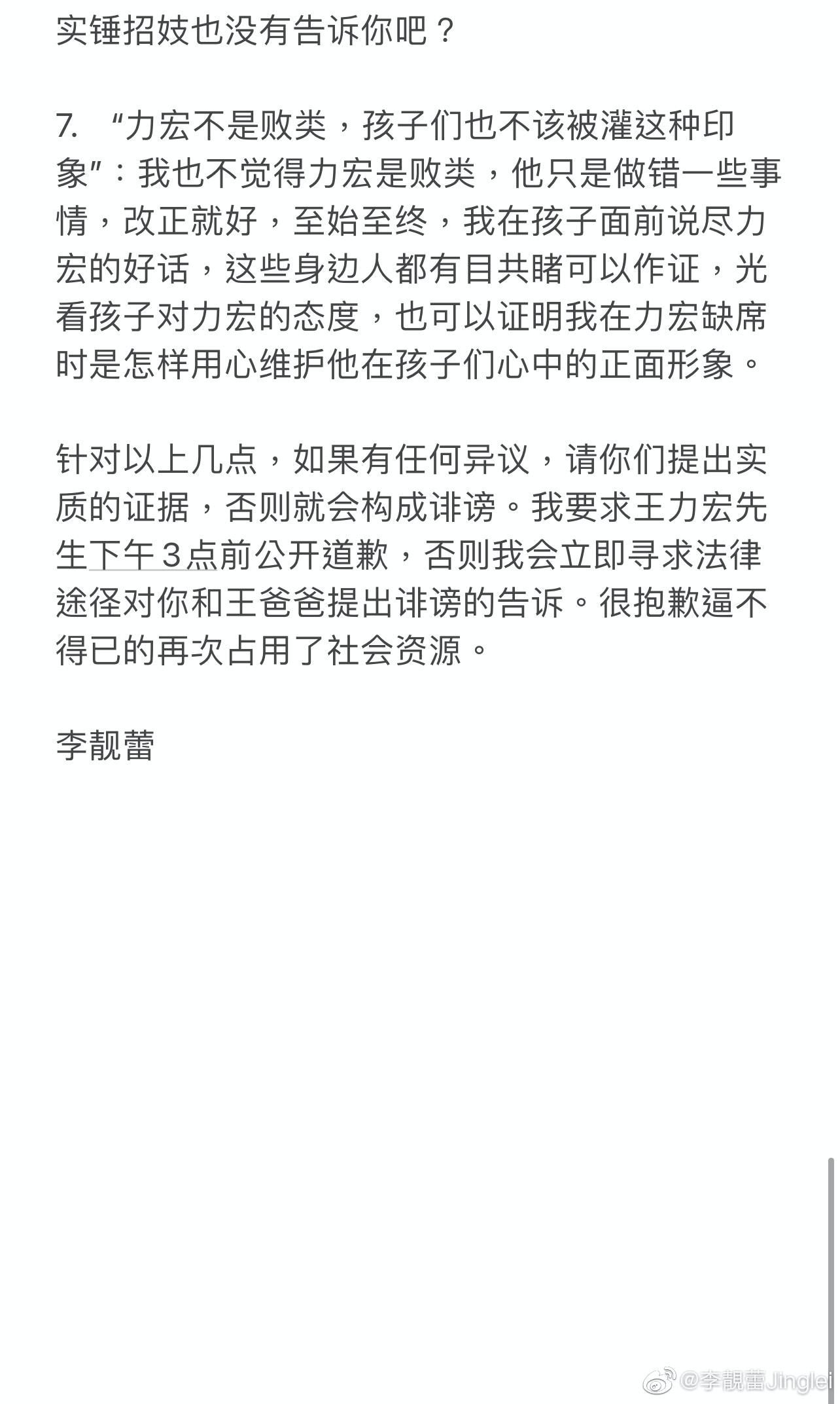 王力宏日前 (15/12) 被爆與李靚蕾離婚後,遭李靚蕾毀滅式爆料盡揭他渣男的一面,今日凌晨王力宏爸爸親撰信反指控她當年借肚迫婚等惡行,李靚蕾隨即於今早七時多在微博發文反擊,再次撰寫數字千長文逐點擊破王爸爸的指控,且繼續爆料,並發出最後通牒要王力宏於下午3時前道歉。