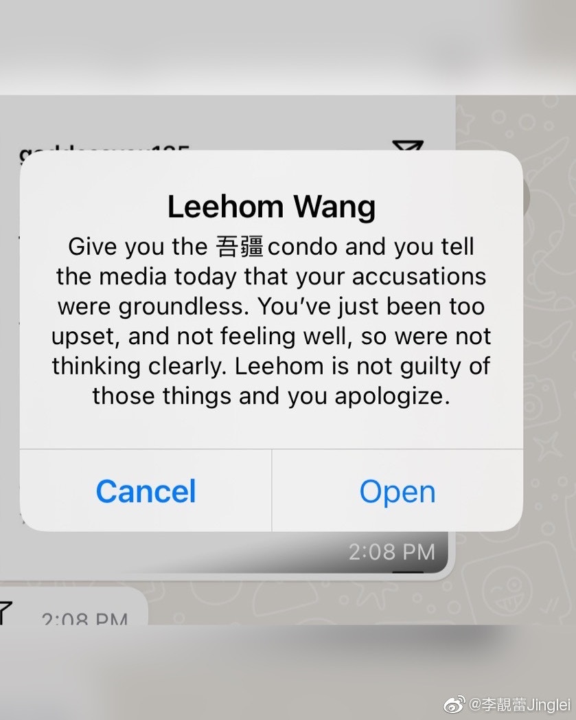 李靚蕾曬出王力宏給他的信息,王力宏所指的房子「吾疆」,就是市值台幣4億元、位於台北仁愛路的豪宅。(李靚蕾微博)