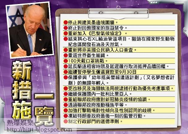 美國候任總統拜登周三(20日)正式上任,過渡團隊在就職禮前夕公布,拜登上任後首天將以簽署行政命令、備忘錄、指令等方式,實施17項新政,包括簽署15項行 ...