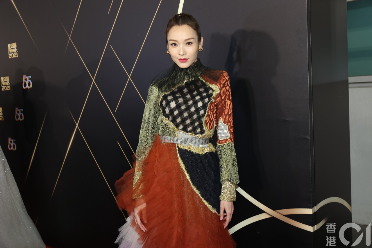 鍾嘉欣的網狀上衣入面勁性感,不過襯了閃閃西裝外套,太過花巧。(梁碧玲攝)