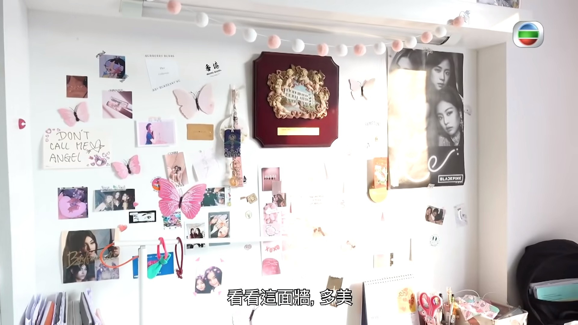 牆上亦貼滿韓國女團BLACKPINK的周邊產品,Chantel直認是BLACKPINK粉絲。(影片截圖)