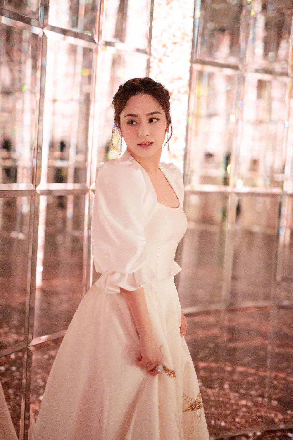 阿嬌身穿白色泡泡袖長裙。(微博圖片)