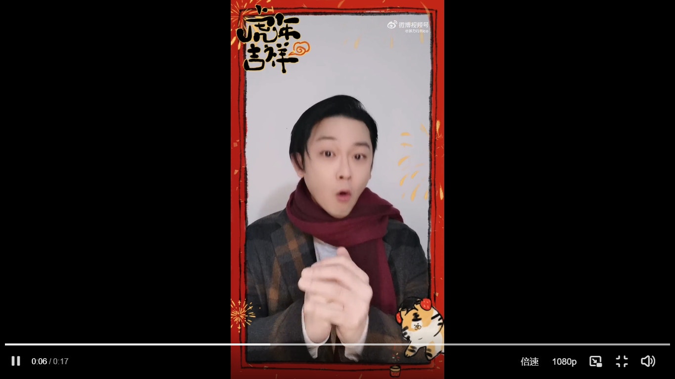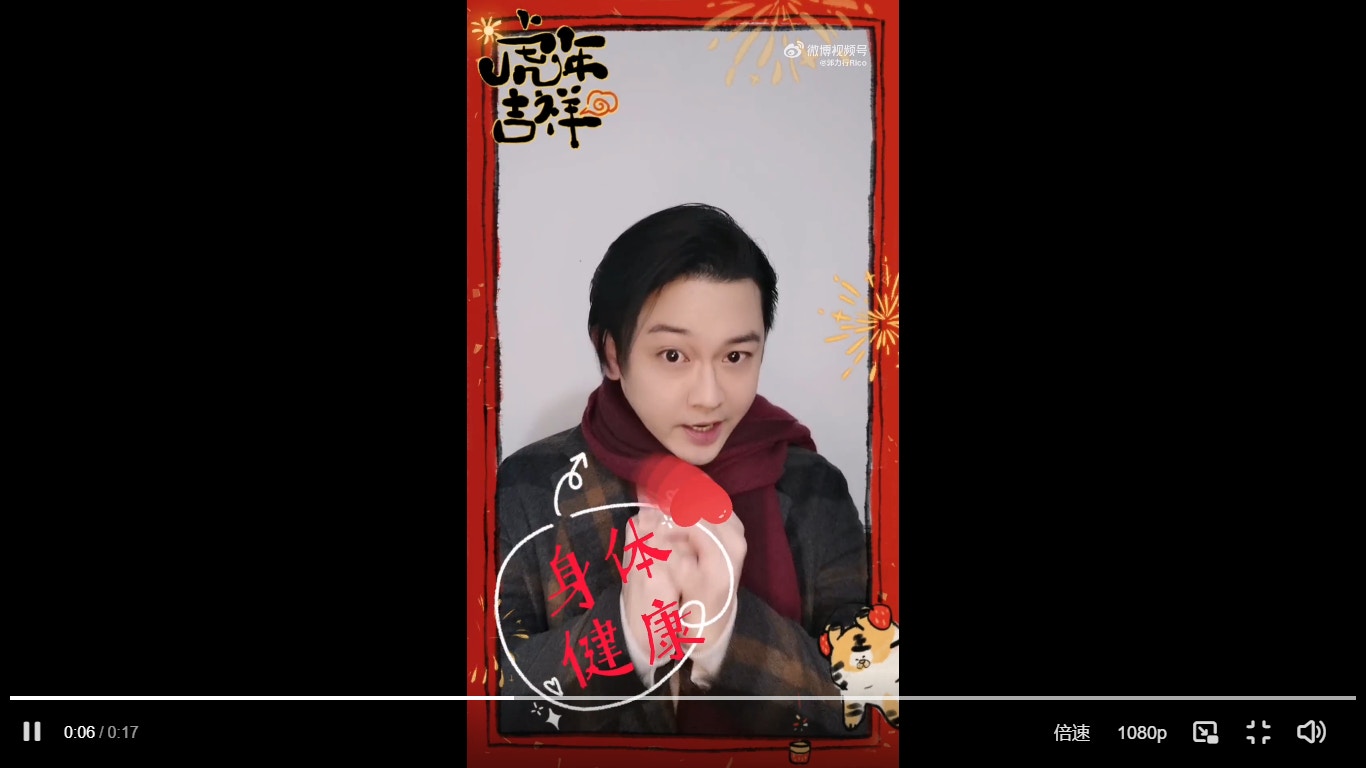 Rico今年拍攝了一條向觀眾拜年的片段,雖然開了濾鏡,但仍不算很肥,至少臉部沒有像《家族榮耀》一樣腫脹。(《影片截圖》)