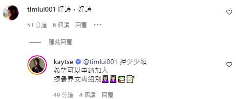 現年45歲的謝安琪(Kay)是靚媽一名,外表保養得相當好,而且又會同老公張繼聰一齊做gym keep fit。日前,Kay在IG貼出一張自拍照,見到戴上了眼鏡的她跟平時增添文青感,加上超完美的皮膚狀態,看上去似是得二十多歲,有着滿滿的少女感。Kay還詩意大發,留言寫了一首「新詩」︰「落雨濕濕,想出外拍攝又唔得,諗咗一陣諗可以做乜,突然……好想去揼骨」,完全押晒韻!她回覆留言時表示︰「押少少韻,希望可以申請加入揼骨界文青組別。」好有創意。