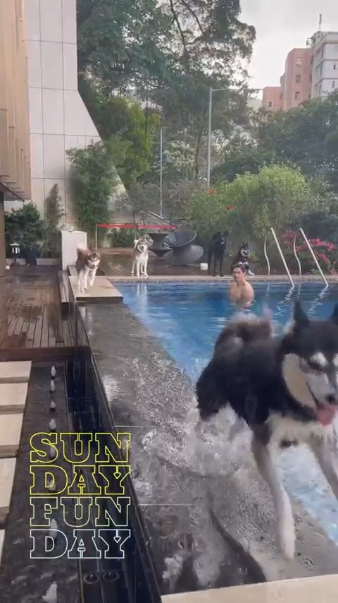 Lynus在社交平台上載了在家中的泳池與六隻哈士奇犬耍樂的片段 (ig@lynuswoo)