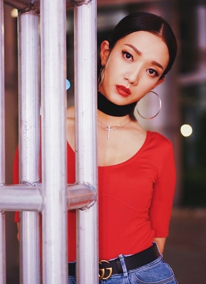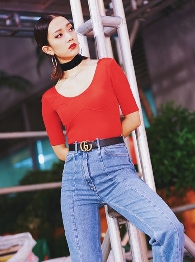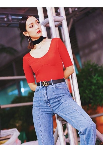 王君馨以紅色貼身圓領上衣配上百搭的牛仔褲,為沉穩中帶來驚喜。(gwgurlie86@Instagram)