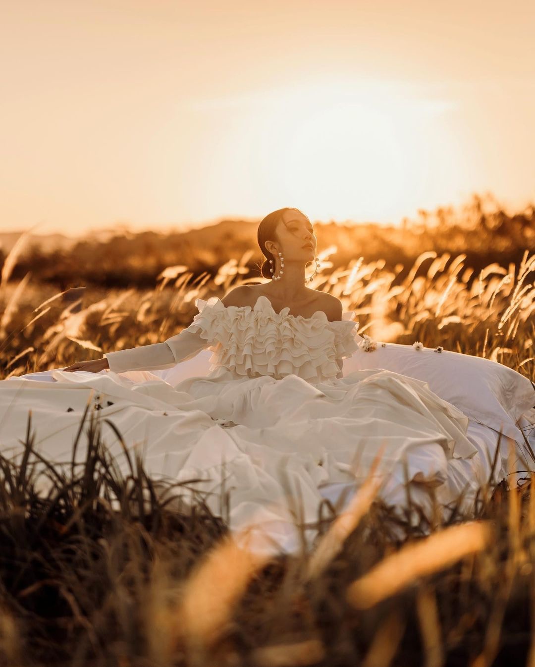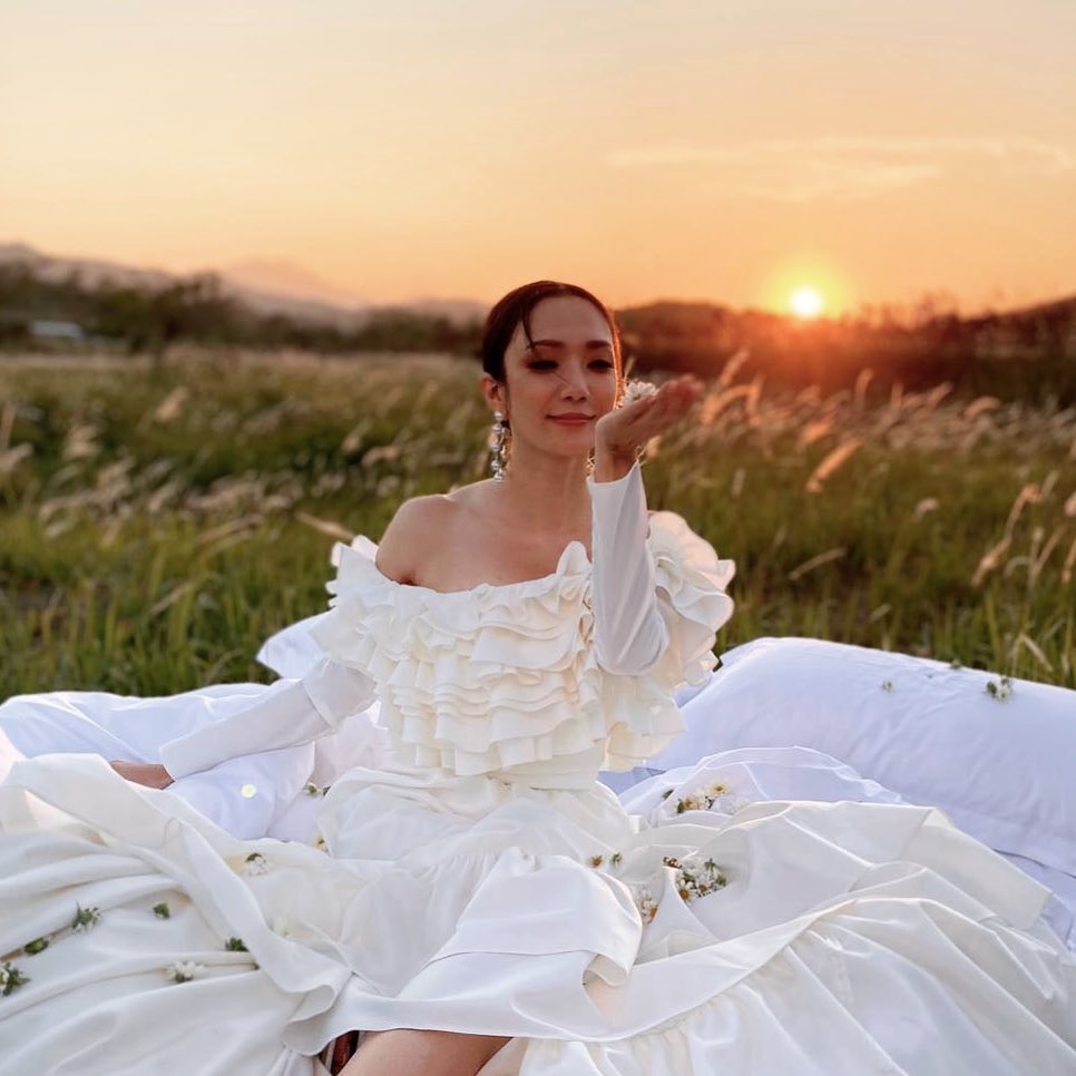 王君馨身穿一字肩長袖婚紗拍攝。(IG@gwgurlie86)