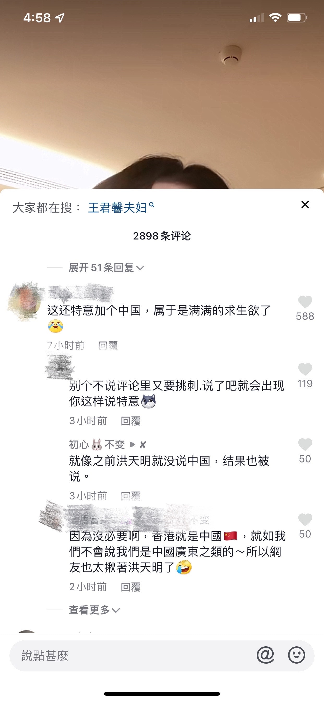 前車可鑑,Grace應該有留意到這些新聞,因此拍攝了這個「我是XX」時候,第一句講「我叫王君馨,中國香港的」,但也有網友不滿意,留言寫道:「還特意加個中國,屬於是滿滿的求生慾了」,其後這名網友被一眾網友圍插,因為認為他特意製造一些帶刺留言。