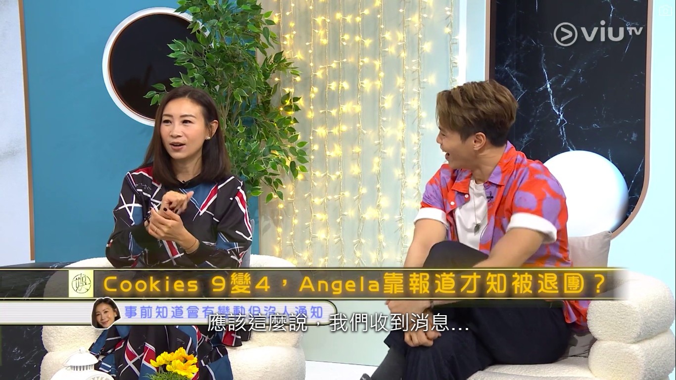 Angela在節目中講到當年有成員是睇電視節目才得知自己被Out時,她就大爆自己當時也是睇雜誌才知道這件事,與其餘4位成員一樣,直言不是她自己主動退出Cookies,而是「被退團」。Angela表示她們當年因為轉公司,其實早已收到風,但就從來沒有人正面地跟她說過退團的事,直至那期雜誌出街她才知道:「哦!原來我係被退團嗰個!」她認為那篇雜誌報道應該是公司主動放料出來,又笑言:「嗰時唔興叫退團,係叫『單飛』。」
