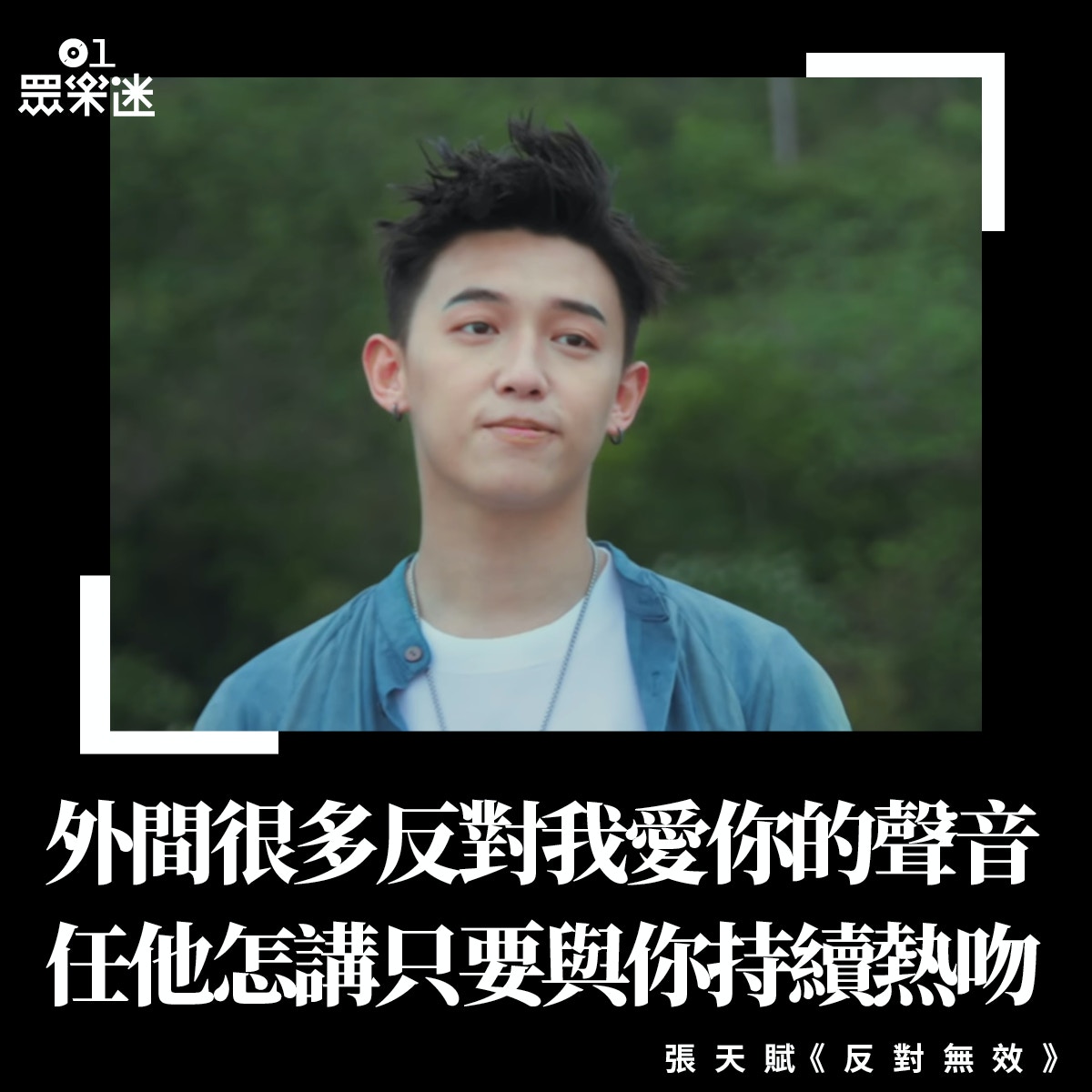 「外間很多反對我愛你的聲音/任他怎講只要與你持續熱吻」 - MC張天賦《反對無效》 來到個人第二首單曲,MC不但展示自己能駕馭R&B這種大熱曲風,更唱出陳詠謙筆下一句句甜入心的歌詞。若然自己經歷的愛情被身邊的人不看好、反對,這句歌詞的威力自然倍增。(01製圖)