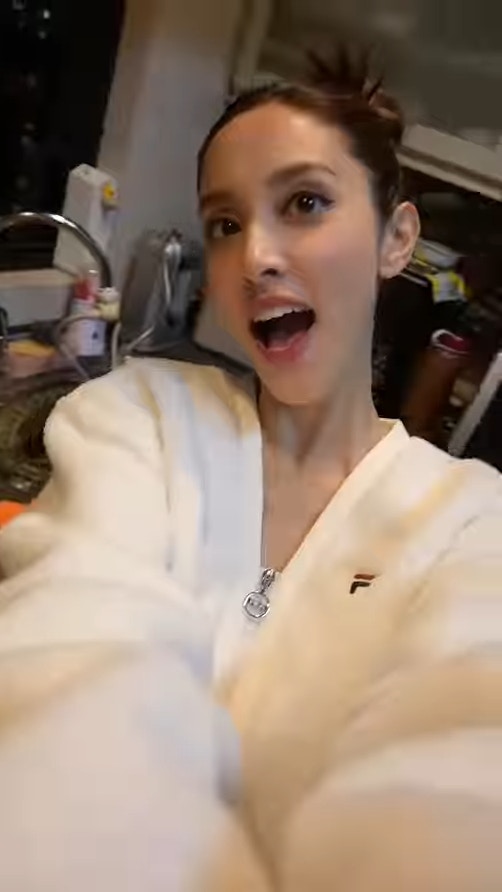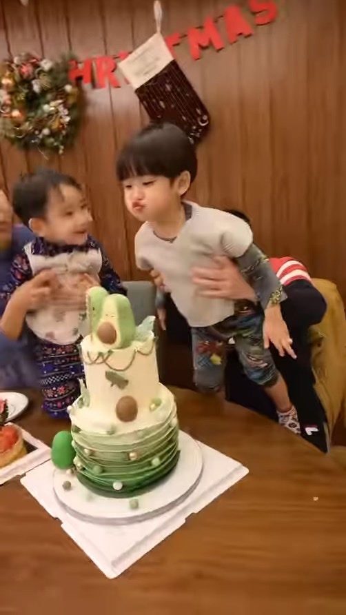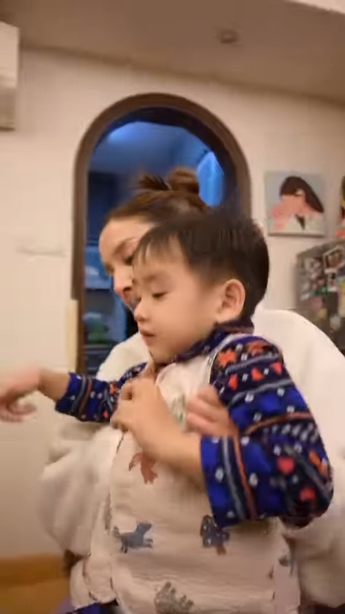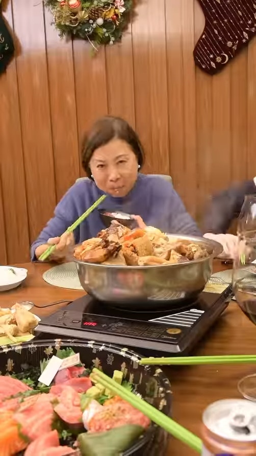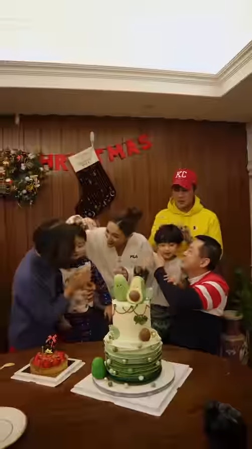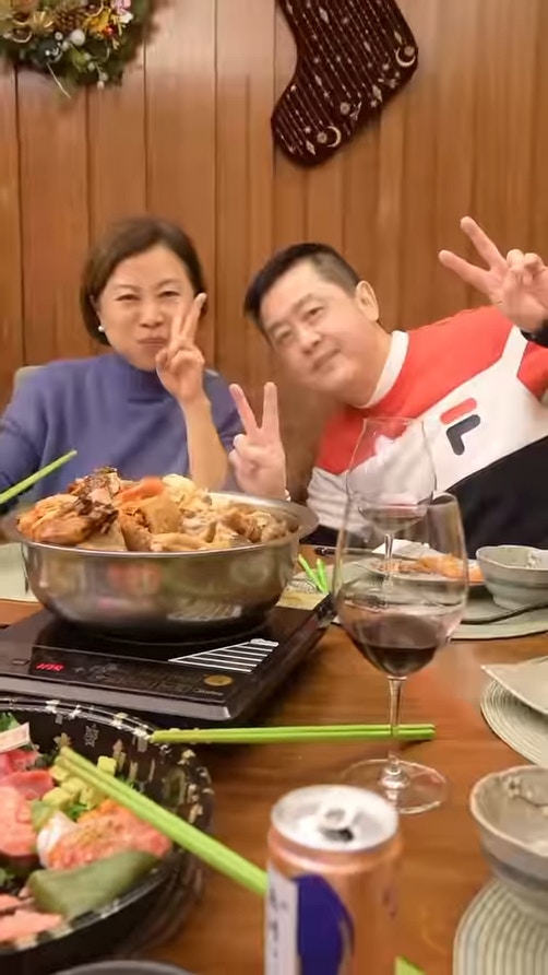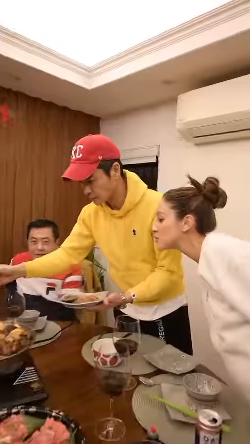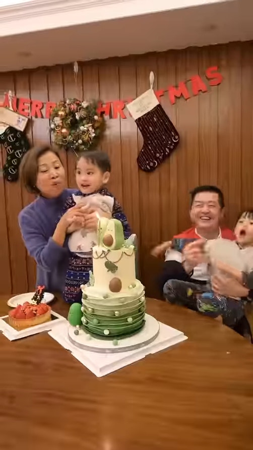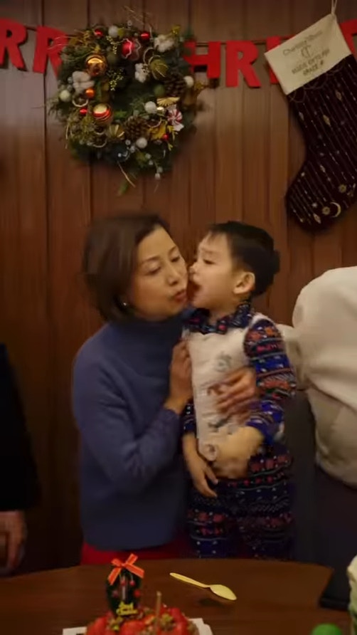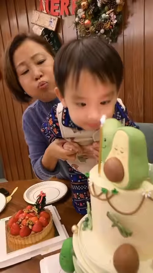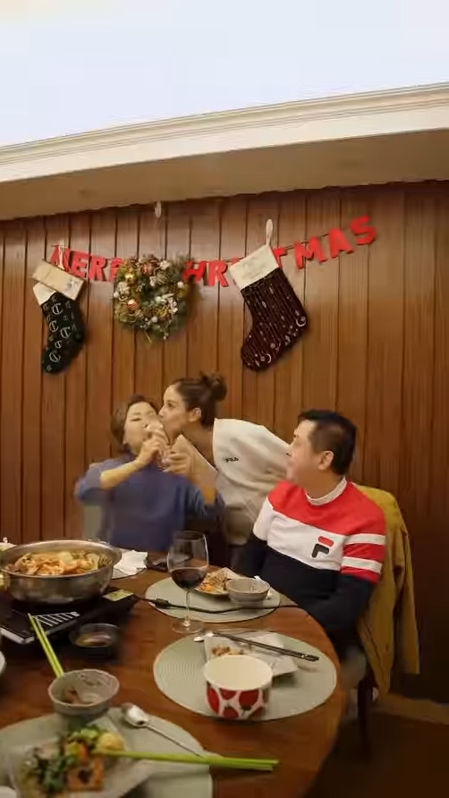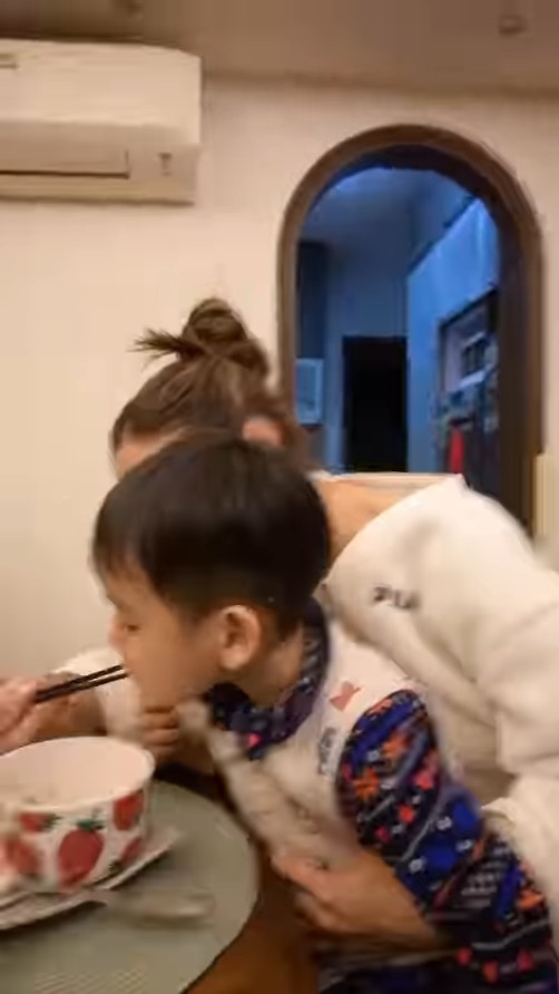 片中可見他們一家與親友在家中食晚飯,菜式包括有名貴海味盤菜,蒸魚、還有大拖羅等貴價刺身,餸菜相當豐盛,大人食得開心,小朋友都玩得好開心。Grace又親吻了爸媽,她的兩個仔仔都有錫錫公公婆婆,畫面十分之溫馨。而Grace的仔仔就愈大愈靚仔,尤其是大仔Rafael更是與公公愈來愈似樣,一雙眼睛勁精靈,印證了隔代遺傳。