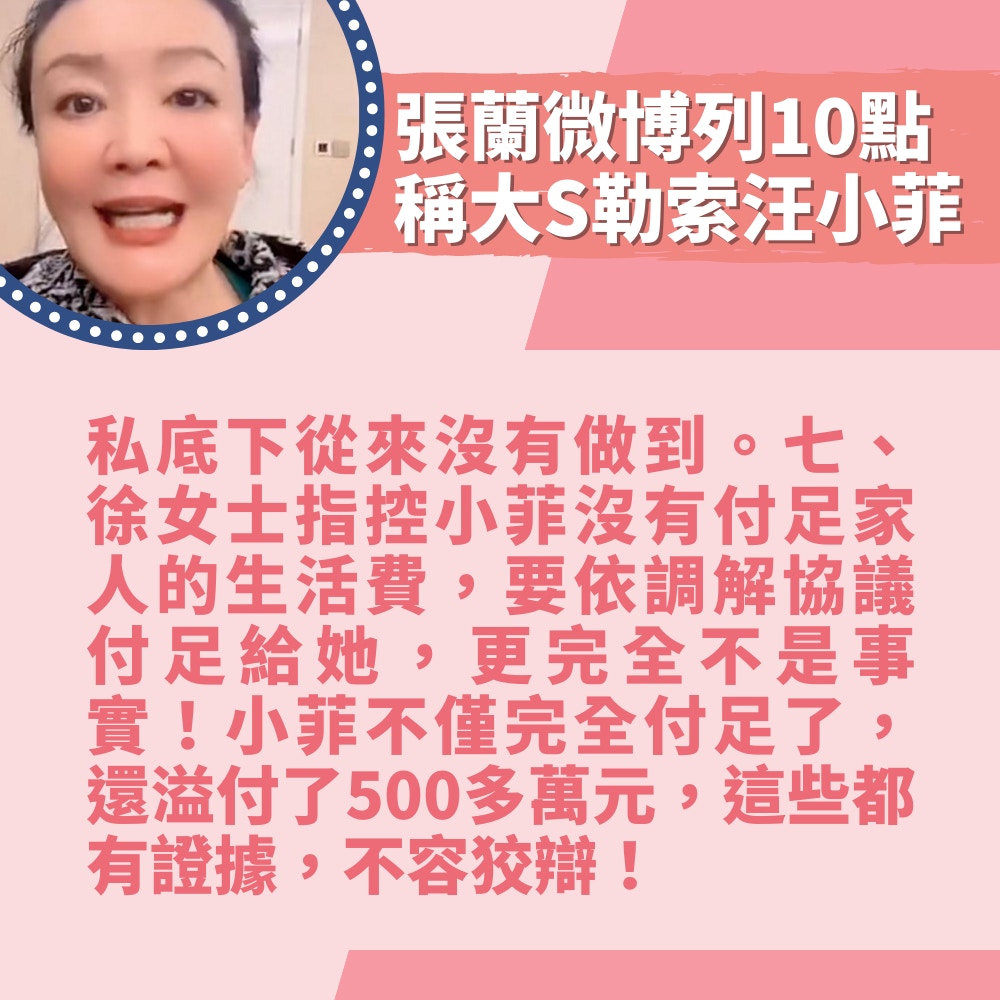 張蘭列10點稱大S勒索汪小菲「恐嚇訊息我都留著」結婚疑另有目的(微博@張蘭/01製圖)