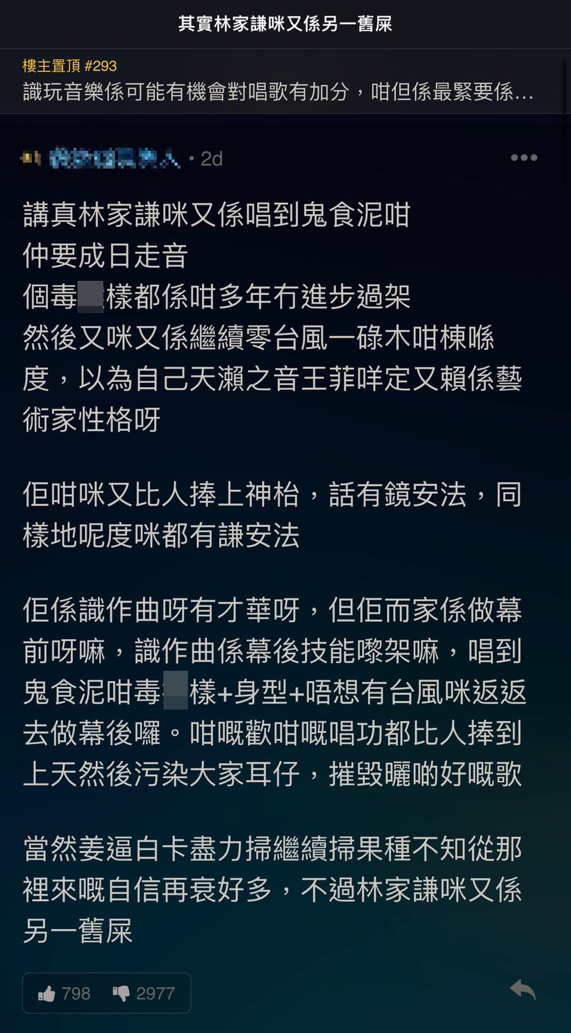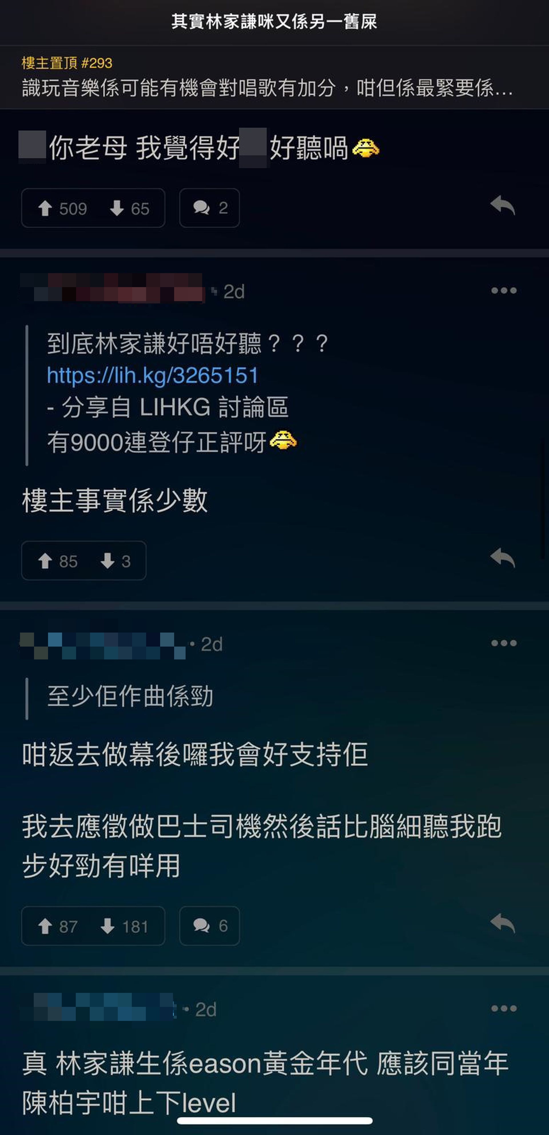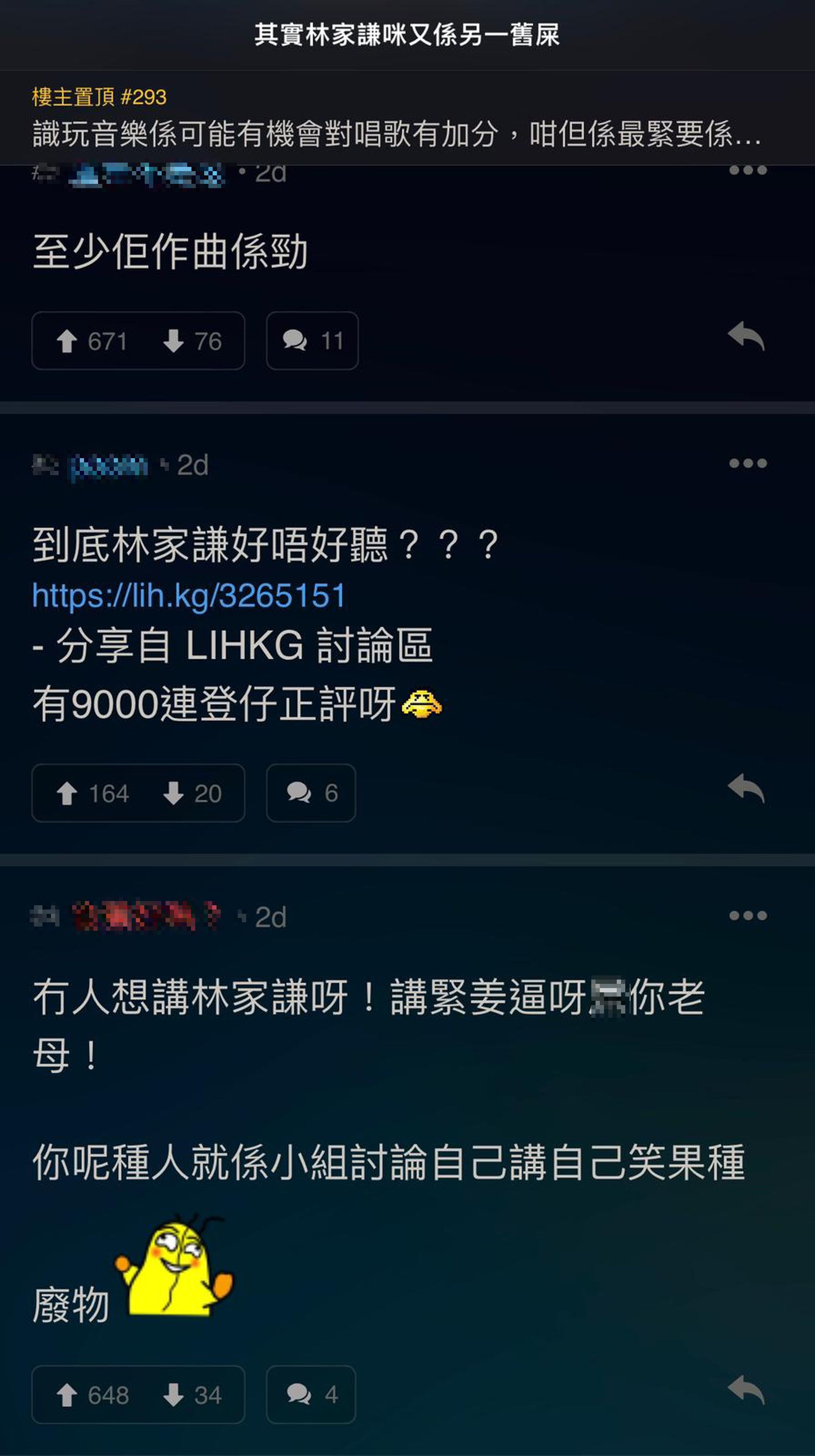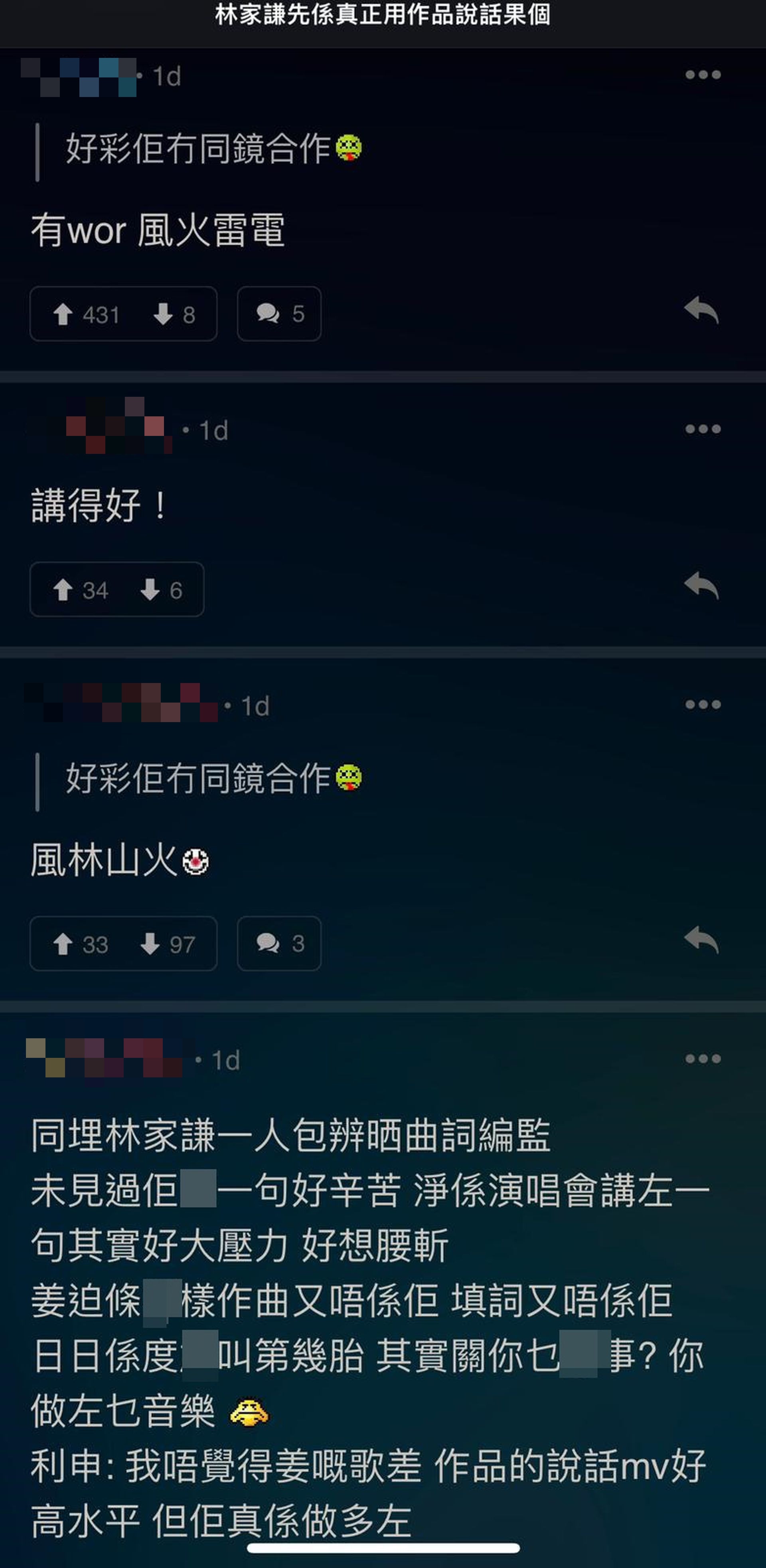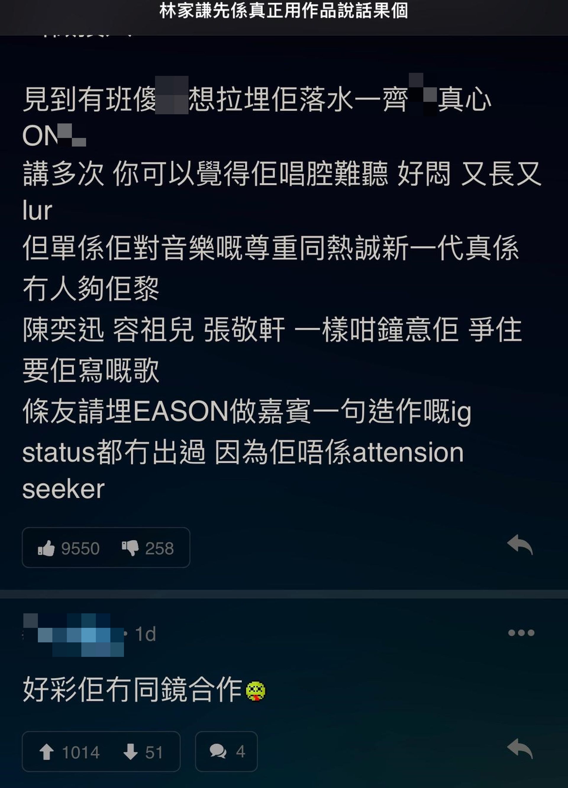 不過此番言論就惹來大批網友批評,收到近3000個負評。網友指樓主轉移視線,打算趁機踩林家謙,但林家謙明明比姜濤態度好、有音樂才華,「至少佢作曲真係勁」、「林家謙藝人包辦曲詞編監,未見過佢X過一句好辛苦」、「我覺得好X好聽喎」、「又想拖埋其他人落水」、「樓主事實係少數」。