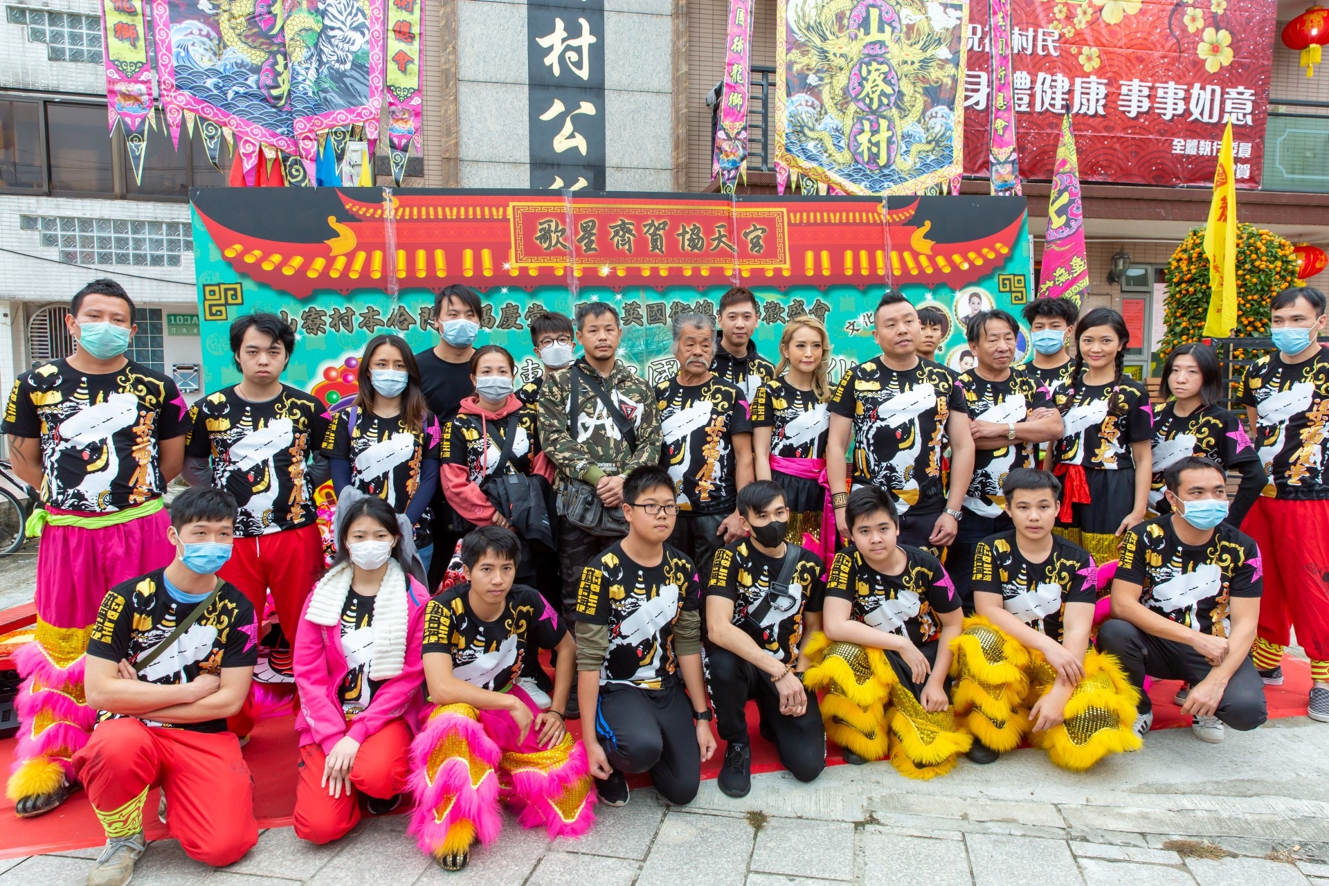 林雅詩(Grace)與馬天樂今日(4/2)連同醒獅隊現身大埔出席一年一度新春團拜盤菜宴活動,二人更即席舞起獅頭助慶為香港祈福。(葉志明攝)