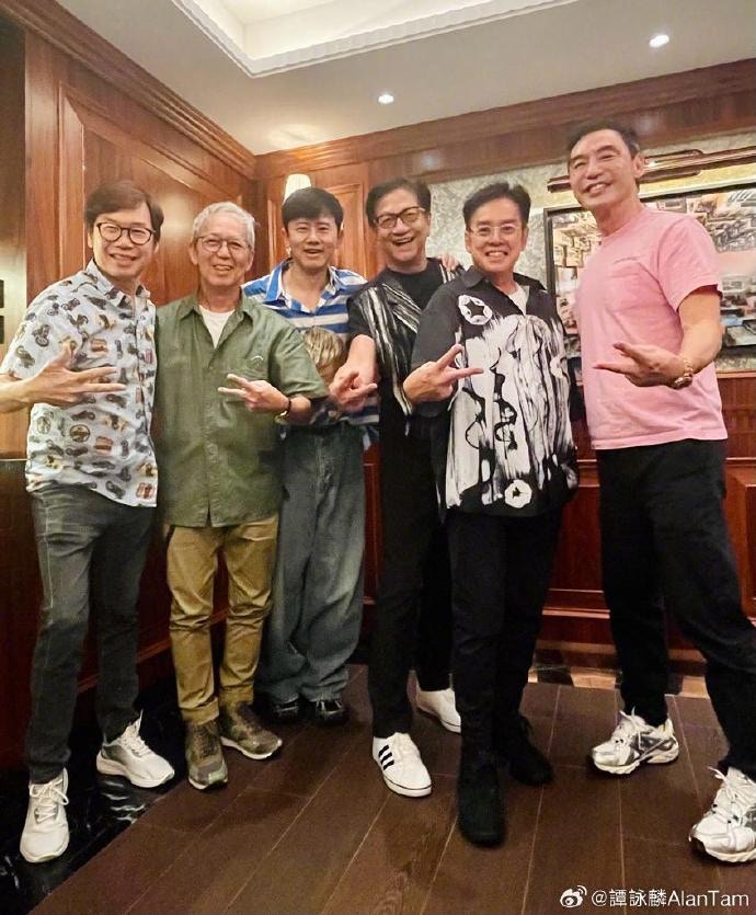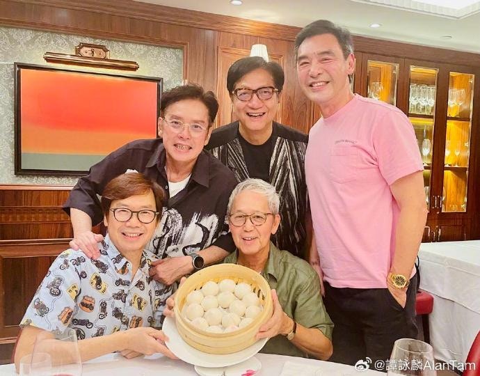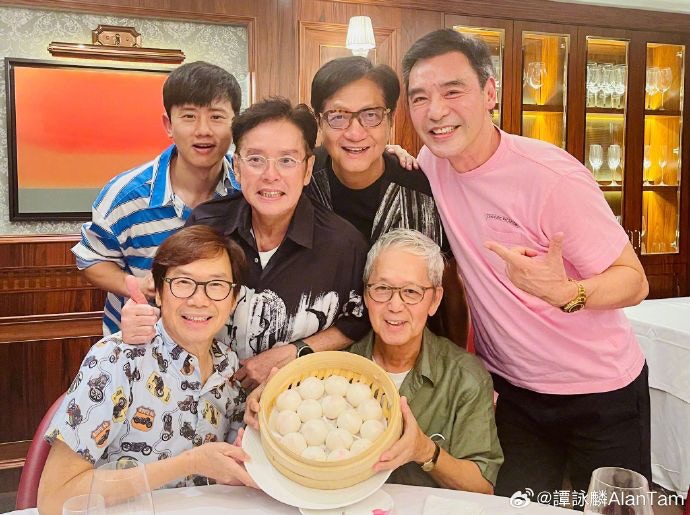 日前是葉智強生日,溫拿一班好友當然會為他慶生,譚詠麟便把慶生照分享至社交網。壽星葉智強坐在前方,手持一籠包,位位年過70依然精神爽利。早前自爆暴瘦15磅的譚詠麟已回復精神,更因瘦了一圈顯得後生許多,巨肚已消減不少。而鍾鎮濤、彭健新、陳友也精神奕奕,唯獨葉智強一頭白髮,顯得比其他成員蒼老,不夠其他成員保養得宜,不過他笑容滿臉,心情大好,似乎已擺脫對外表的執著。