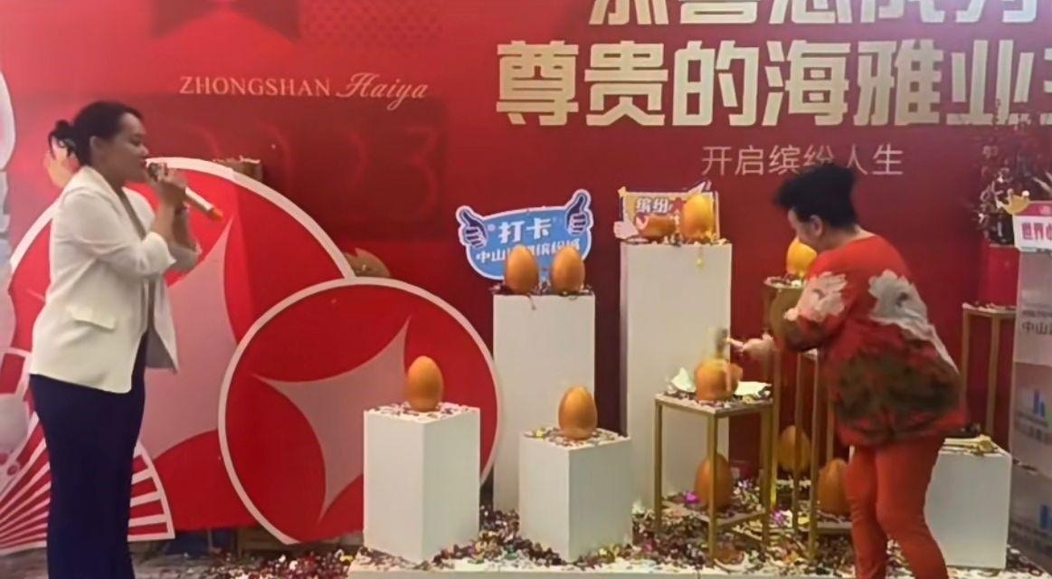 除了在港擁有多個物業外,家燕姐近年似乎進軍內地樓市,莫非打算在內地發展?近日有家燕姐被拍下現身再中山一個樓盤,家燕姐穿得喜氣洋洋出席收樓儀式,背景板寫上恭喜成為業主的祝福語。家燕姐手持錘仔,主持人倒數完後,她即用錘仔打爆金蛋,現場再飄下彩帶,家燕姐即時開心到笑到四萬咁口。